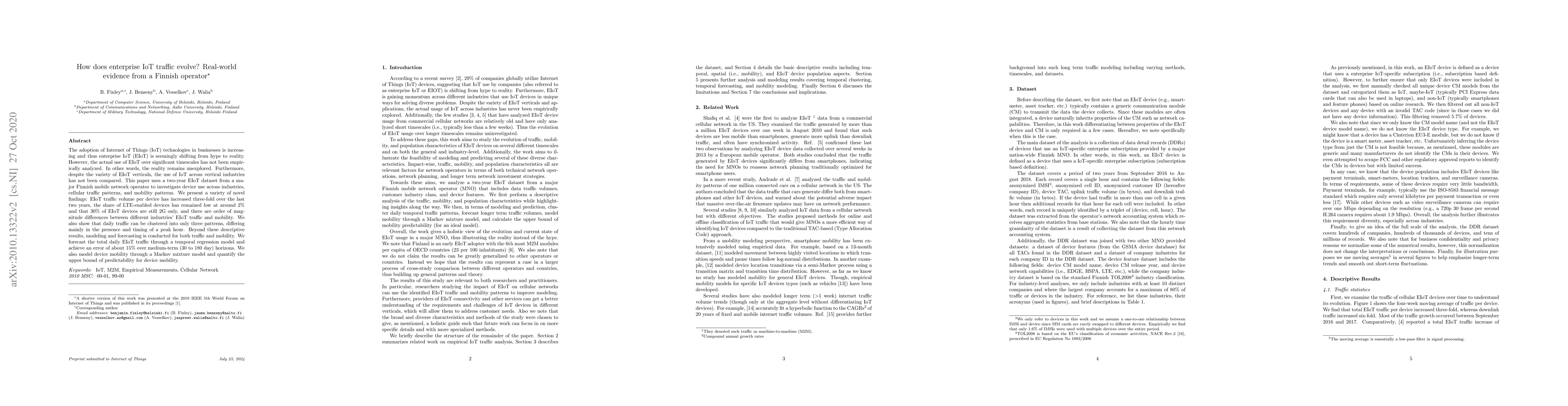 This paper analyzes a two-year dataset from a Finnish mobile network operator to explore enterprise IoT (EIoT) traffic evolution, revealing a three-fold increase in traffic volume per device, low LTE adoption, and significant industry-based traffic and mobility differences. Forecasting models predict medium-term EIoT traffic with 15% error and quantify device mobility predictability.