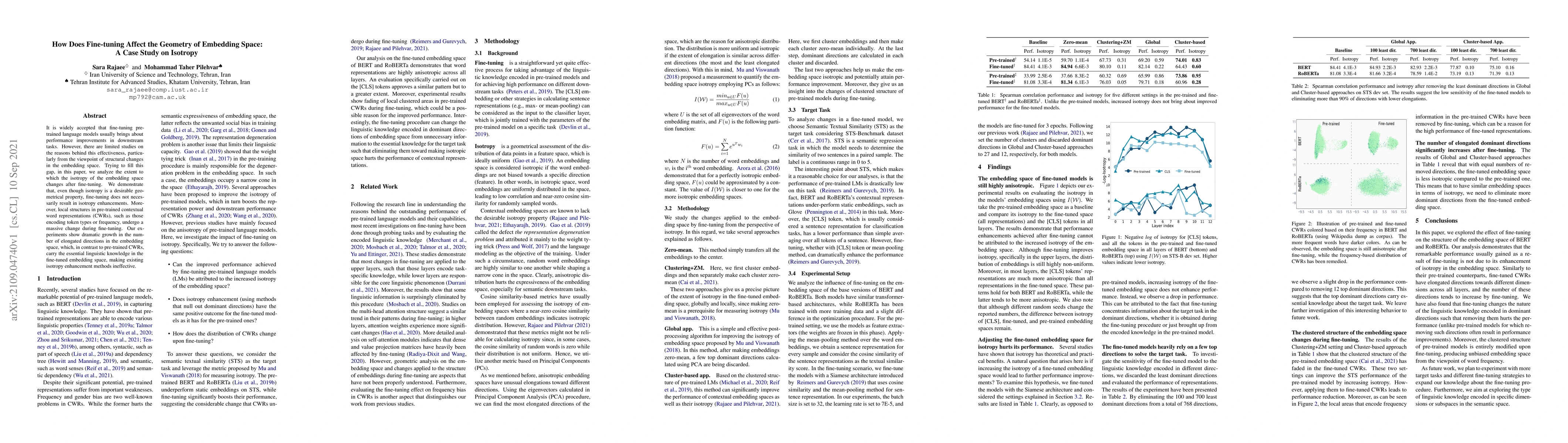 This paper investigates how fine-tuning pre-trained language models alters the geometry of the embedding space, focusing on isotropy. It finds that fine-tuning does not necessarily enhance isotropy and instead causes significant changes in local structures, leading to an increase in elongated directions that carry essential linguistic knowledge.