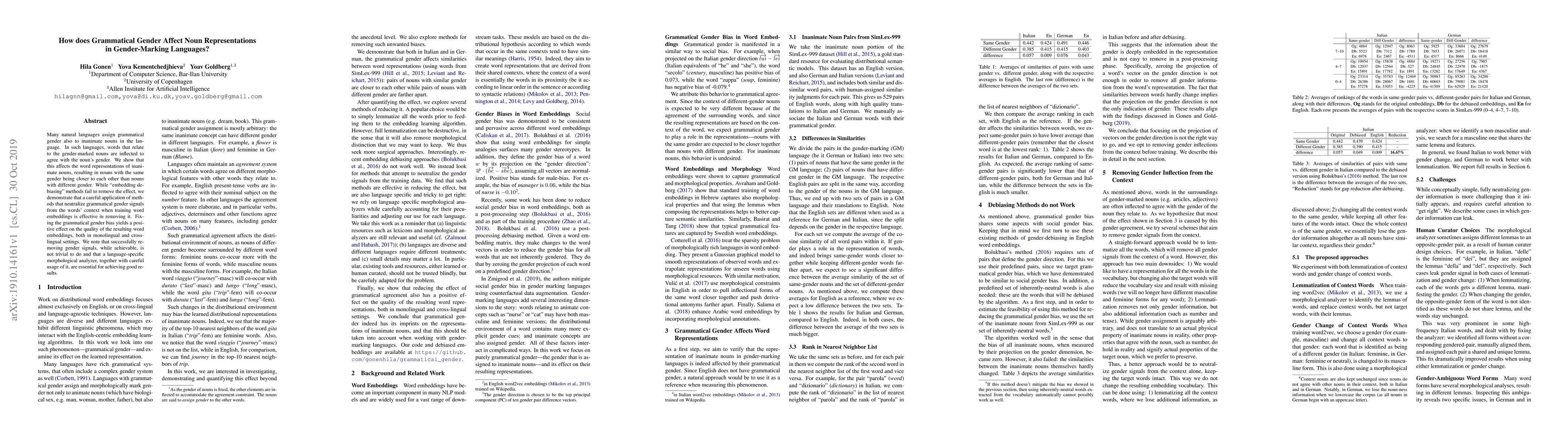 This study explores how grammatical gender in gender-marking languages influences noun representations, finding that gender-neutral word embeddings improve embedding quality. While "embedding debiasing" methods are ineffective, neutralizing grammatical gender signals during training yields better results, though it requires a language-specific morphological analyzer.