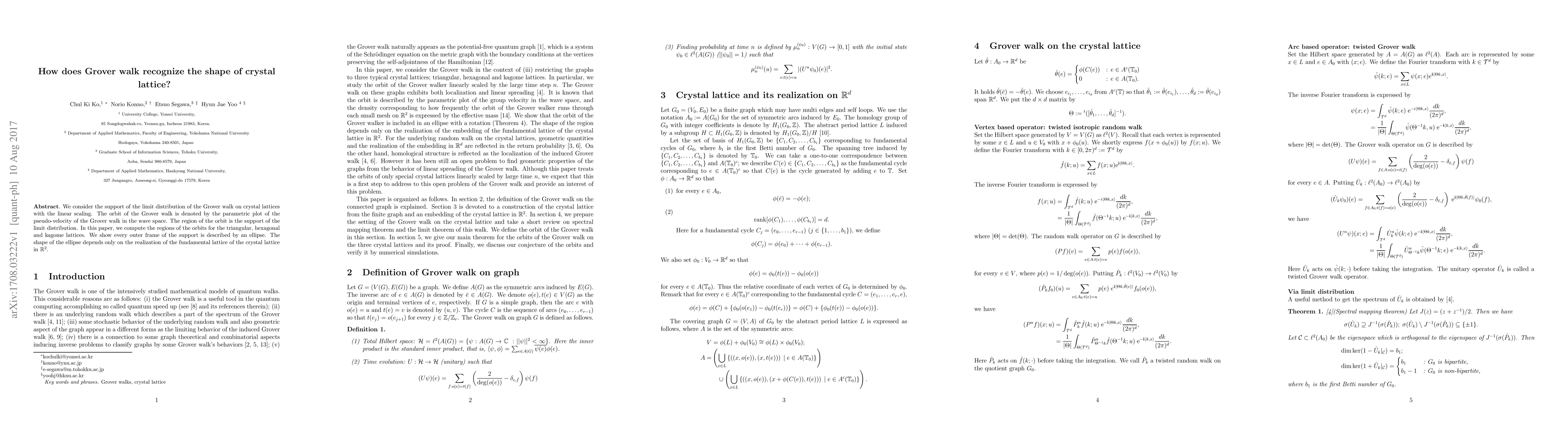 This paper investigates the limit distribution of the Grover walk on triangular, hexagonal, and kagome lattices, demonstrating that the outer frame of the support region is an ellipse whose shape depends solely on the fundamental lattice's realization in $\mathbb{R}^2$. The study reveals the connection between the pseudo-velocity orbit and the crystal lattice's geometric structure.
