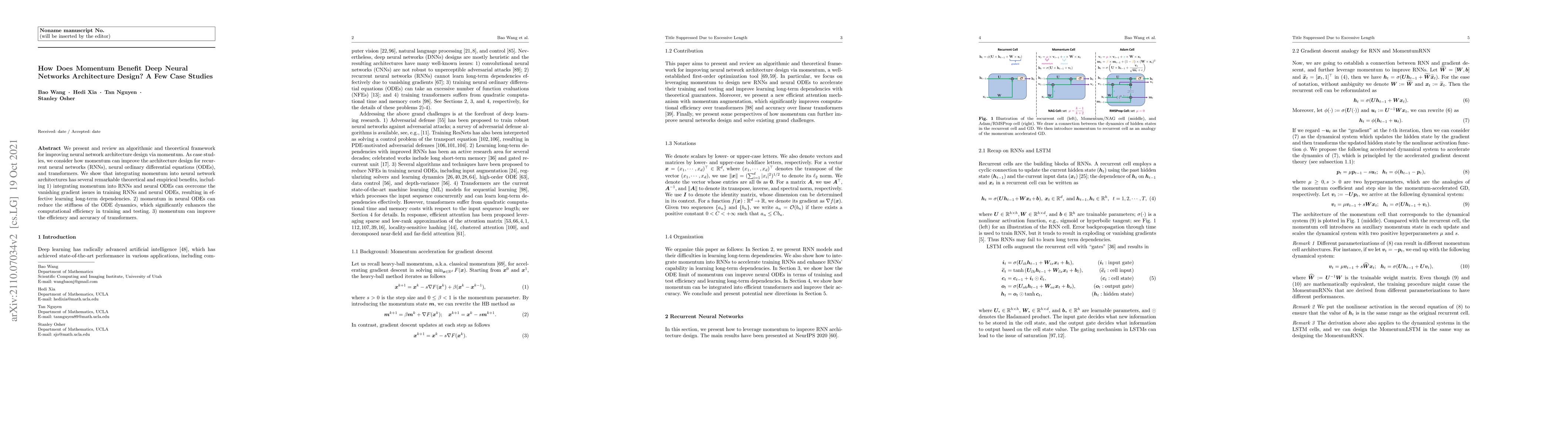 We present and review an algorithmic and theoretical framework for improving neural network architecture design via momentum. As case studies, we consider how momentum can improve the architecture design for recurrent neural networks (RNNs), neural ordinary differential equations (ODEs), and transformers. We show that integrating momentum into neural network architectures has several remarkable theoretical and empirical benefits, including 1) integrating momentum into RNNs and neural ODEs can overcome the vanishing gradient issues in training RNNs and neural ODEs, resulting in effective learning long-term dependencies. 2) momentum in neural ODEs can reduce the stiffness of the ODE dynamics, which significantly enhances the computational efficiency in training and testing. 3) momentum can improve the efficiency and accuracy of transformers.