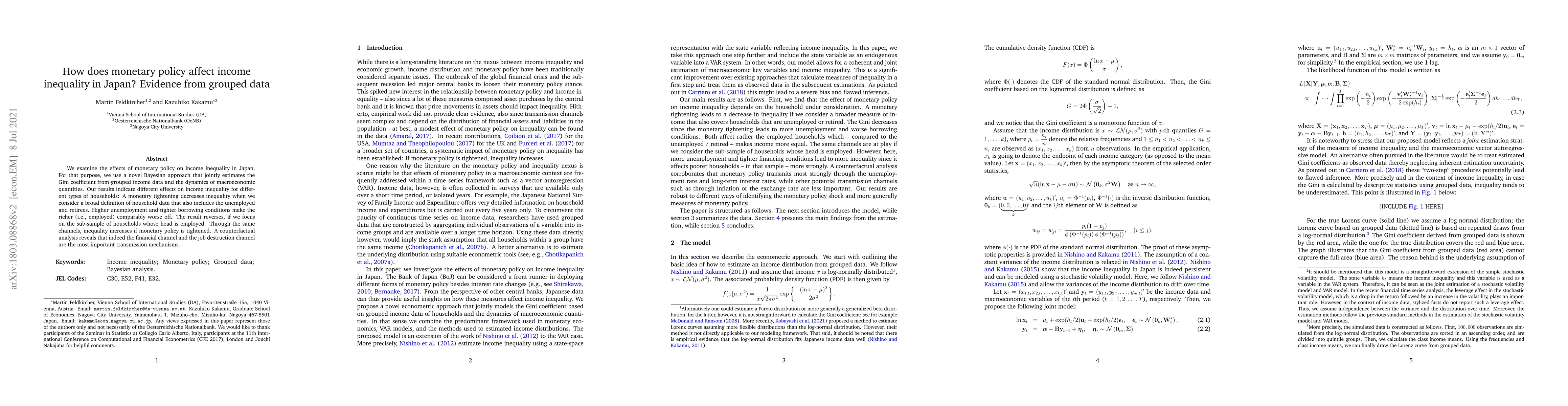 We examine the effects of monetary policy on income inequality in Japan using a novel econometric approach that jointly estimates the Gini coefficient based on micro-level grouped data of households and the dynamics of macroeconomic quantities. Our results indicate different effects on income inequality for different types of households: A monetary tightening increases inequality when income data is based on households whose head is employed (workers' households), while the effect reverses over the medium term when considering a broader definition of households. Differences in the relative strength of the transmission channels can account for this finding. Finally we demonstrate that the proposed joint estimation strategy leads to more informative inference while results based on the frequently used two-step estimation approach yields inconclusive results.