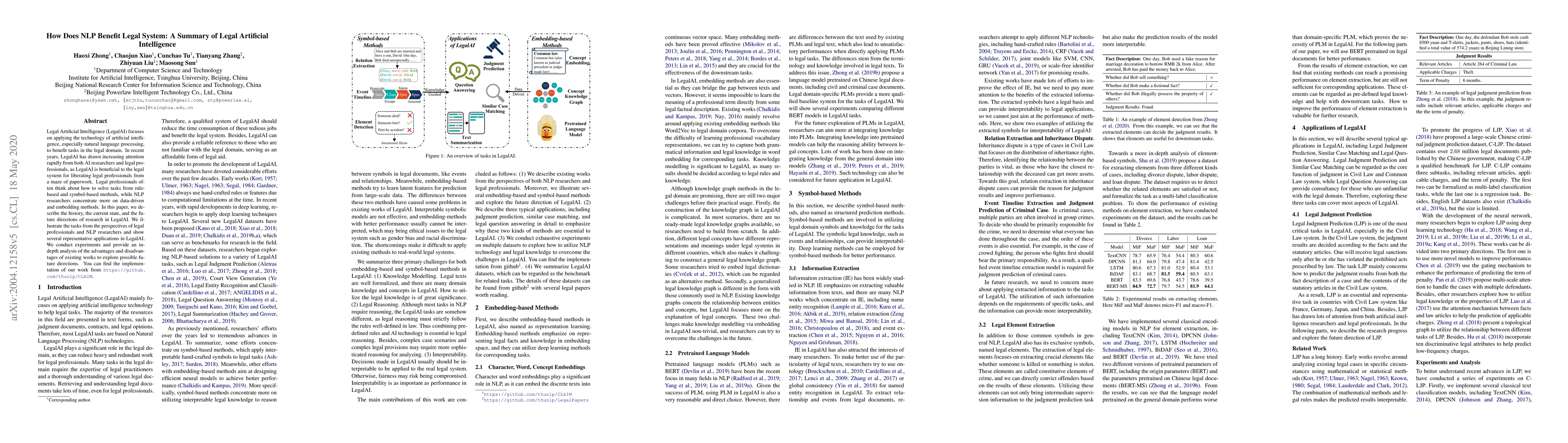 Legal Artificial Intelligence (LegalAI) focuses on applying the technology of artificial intelligence, especially natural language processing, to benefit tasks in the legal domain. In recent years, LegalAI has drawn increasing attention rapidly from both AI researchers and legal professionals, as LegalAI is beneficial to the legal system for liberating legal professionals from a maze of paperwork. Legal professionals often think about how to solve tasks from rule-based and symbol-based methods, while NLP researchers concentrate more on data-driven and embedding methods. In this paper, we introduce the history, the current state, and the future directions of research in LegalAI. We illustrate the tasks from the perspectives of legal professionals and NLP researchers and show several representative applications in LegalAI. We conduct experiments and provide an in-depth analysis of the advantages and disadvantages of existing works to explore possible future directions. You can find the implementation of our work from https://github.com/thunlp/CLAIM.