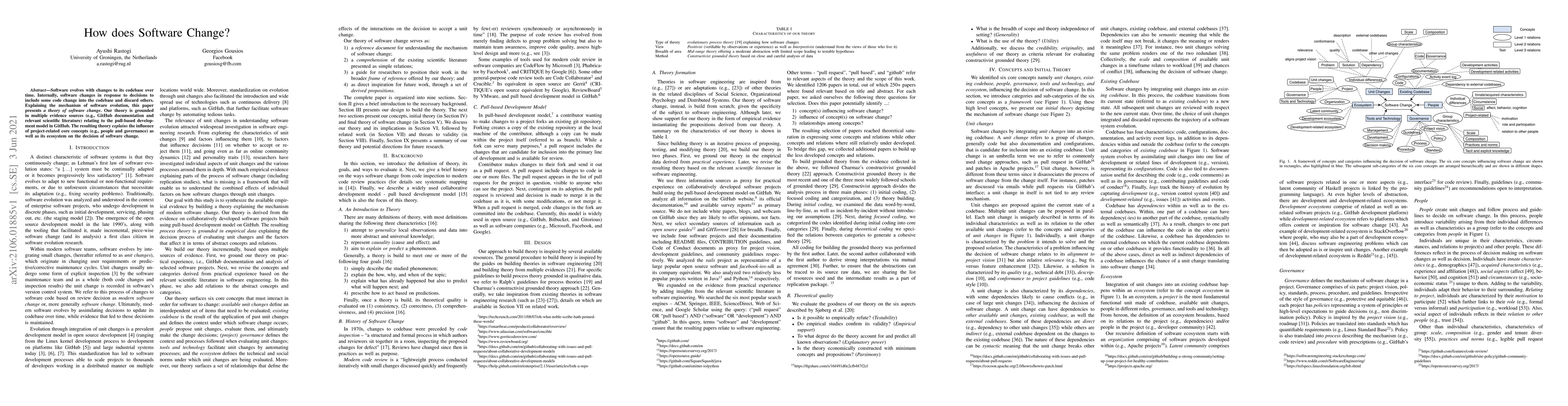Software evolves with changes to its codebase over time. Internally, software changes in response to decisions to include some code change into the codebase and discard others. Explaining the mechanism of software evolution, this paper presents a theory of software change. Our theory is grounded in multiple evidence sources (e.g., GitHub documentation and relevant scientific literature) relating to the pull-based development model in GitHub. The resulting theory explains the influence of project-related core concepts (e.g., people and governance) as well as its ecosystem on the decision of software change.