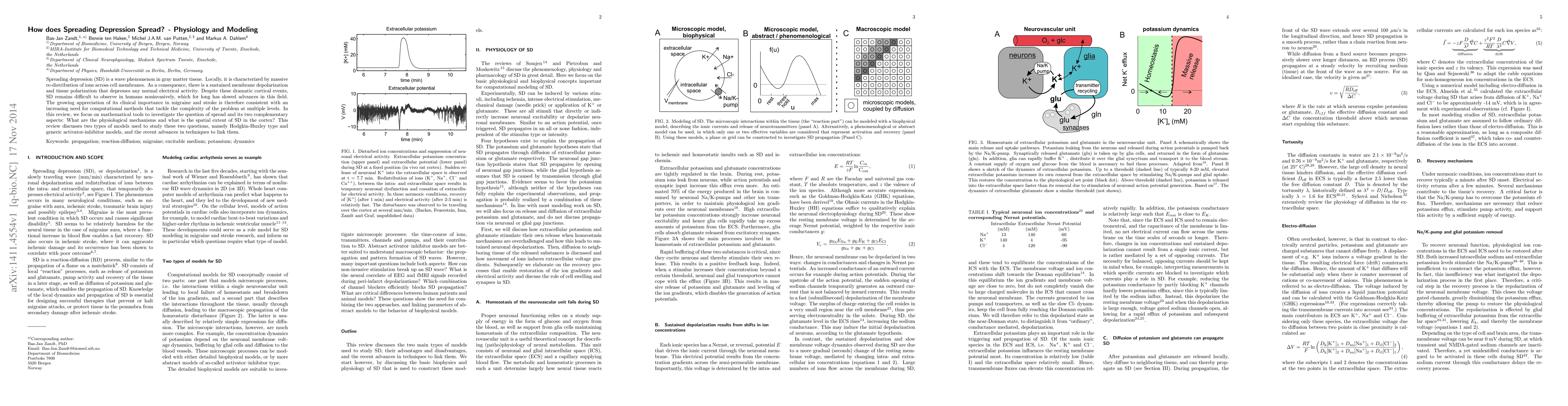 Spreading depression (SD) is a wave phenomenon in gray matter tissue. Locally, it is characterized by massive re-distribution of ions across cell membranes. As a consequence, there is a sustained membrane depolarization and tissue polarization that depresses any normal electrical activity. Despite these dramatic cortical events, SD remains difficult to observe in humans noninvasively, which for long has slowed advances in this field. The growing appreciation of its clinical importance in migraine and stroke is therefore consistent with an increasing need for computational methods that tackle the complexity of the problem at multiple levels. In this review, we focus on mathematical tools to investigate the question of spread and its two complementary aspects: What are the physiological mechanisms and what is the spatial extent of SD in the cortex? This review discusses two types of models used to study these two questions, namely Hodgkin-Huxley type and generic activator-inhibitor models, and the recent advances in techniques to link them.