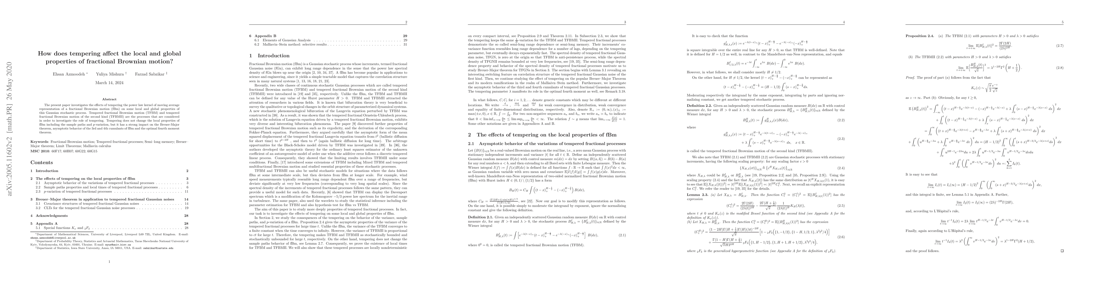 This paper examines how tempering the power law kernel in the moving average representation of fractional Brownian motion (fBm) influences its local and global properties. While tempering does not alter local characteristics like sample paths and p-variation, it significantly affects global properties such as the Breuer-Major theorem, the asymptotic behavior of the 3rd and 4th cumulants, and the optimal fourth moment theorem.