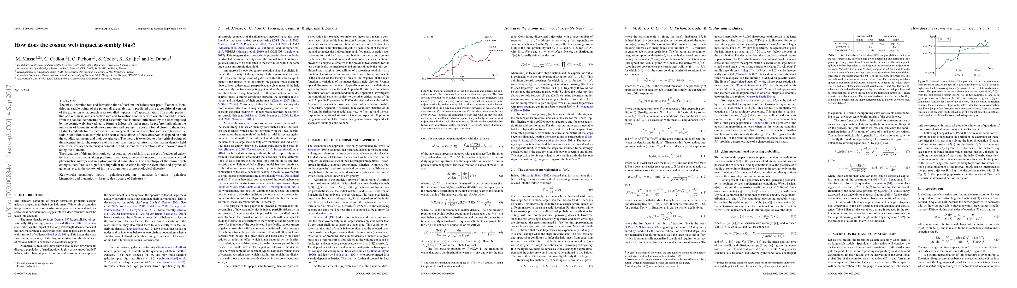 The paper presents an extension of the excursion set theory that accounts for the cosmic web's tides, providing an analytical framework to predict halo properties' anisotropic distribution around saddle points.