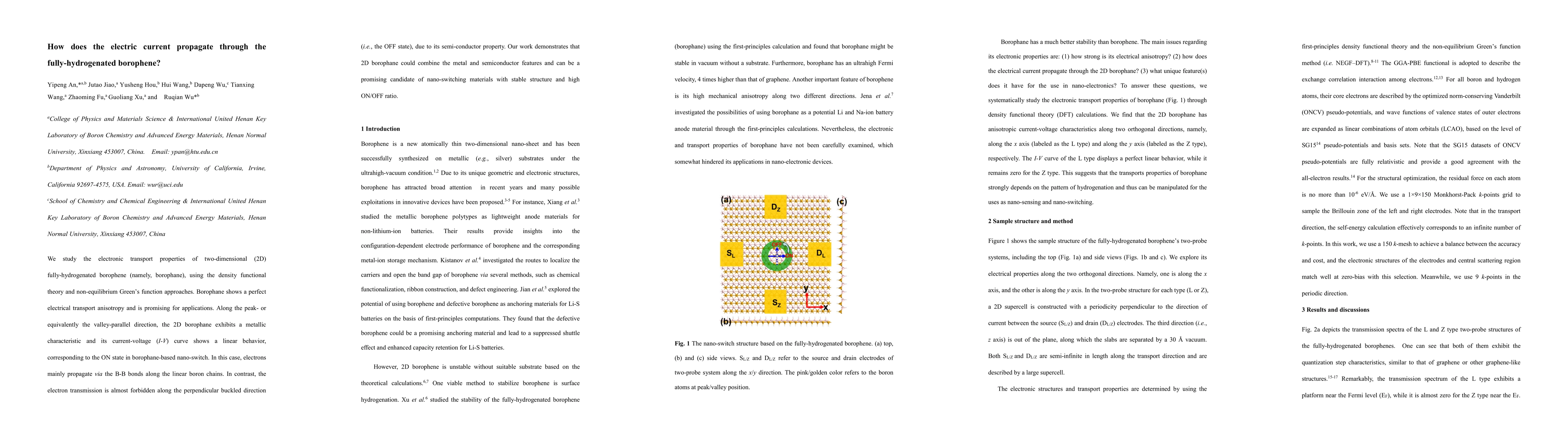 This study uses density functional theory and non-equilibrium Green's function approaches to explore the electronic transport in fully-hydrogenated borophene (borophane), finding it exhibits metallic behavior and linear I-V curves along its peak-parallel direction, while being semi-conducting and almost blocking current along the perpendicular direction, suggesting potential as a nano-switch material.