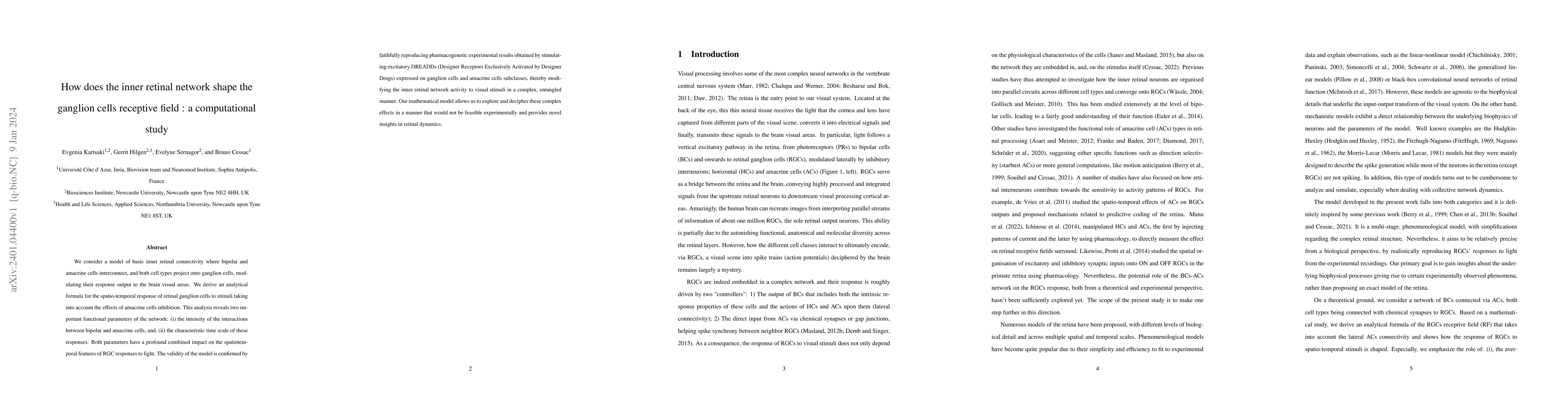 This study develops a computational model to analyze how inner retinal connectivity shapes the receptive field of ganglion cells, revealing that the intensity of bipolar-amacrine interactions and their response time scale significantly influence the spatiotemporal features of ganglion cell responses. The model's accuracy is validated by its ability to replicate experimental results from pharmacogenetic studies.