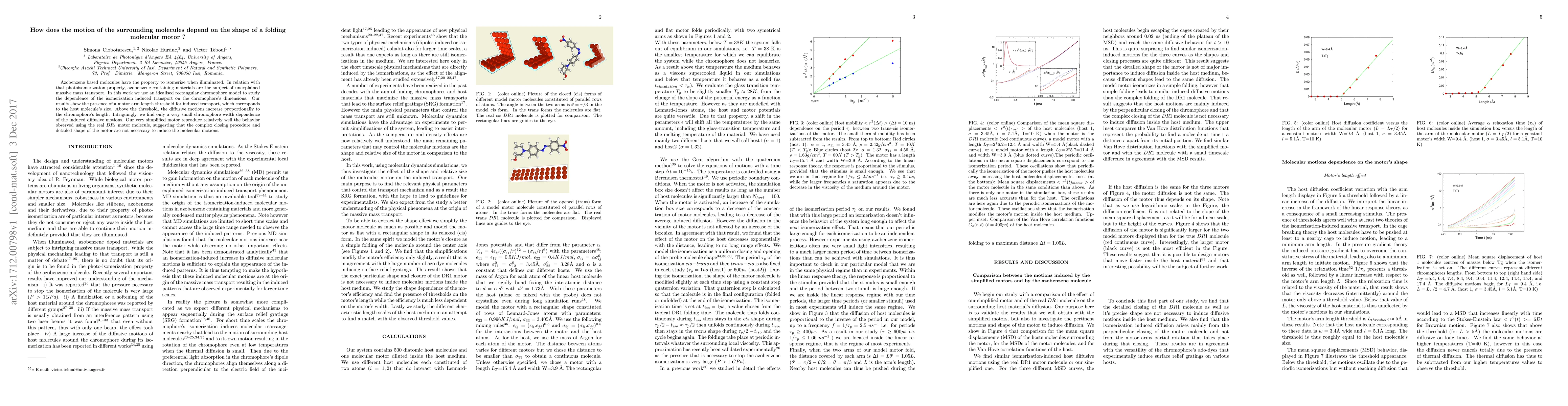 This study investigates how the shape of a folding molecular motor, specifically an azobenzene-based molecule, influences the motion of surrounding molecules during photoisomerization. The results show that above a certain motor arm length, diffusive motions increase proportionally with length, but width has minimal impact, suggesting that the motor's detailed shape is less critical than its overall size for inducing molecular transport.