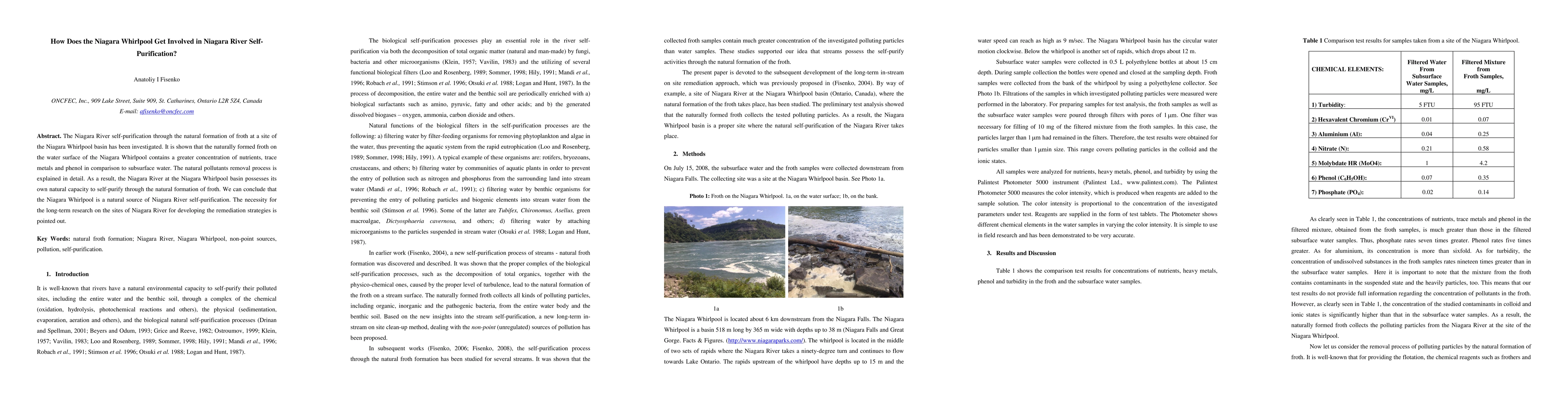 The Niagara River self-purification through the natural formation of froth at a site of the Niagara Whirlpool basin has been investigated. It is shown that the naturally formed froth on the water surface of the Niagara Whirlpool contains a greater concentration of nutrients, trace metals and phenol in comparison to subsurface water. The natural pollutants removal process is explained in detail. As a result, the Niagara River at the Niagara Whirlpool basin possesses its own natural capacity to self-purify through the natural formation of froth. We can conclude that the Niagara Whirlpool is a natural source of Niagara River self-purification. The necessity for the long-term research on the sites of Niagara River for developing the remediation strategies is pointed out.
