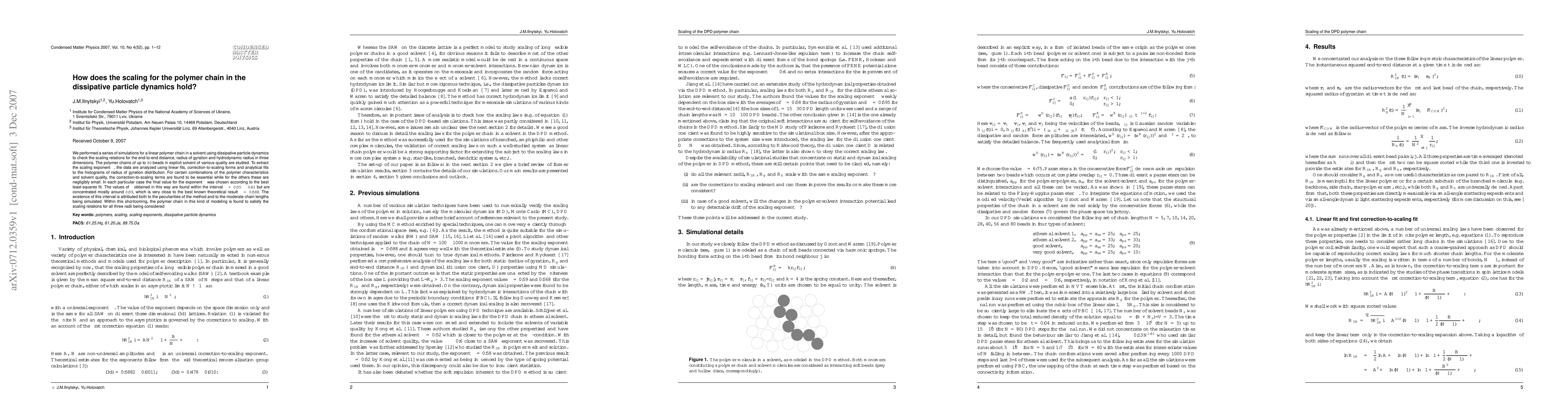 This study investigates the scaling behavior of polymer chains in dissipative particle dynamics simulations, finding that the scaling exponent ν for end-to-end distance, radius of gyration, and hydrodynamic radius ranges from 0.55 to 0.61, mostly around 0.59, closely matching theoretical predictions. The deviations are attributed to the method's limitations and the moderate chain lengths used.