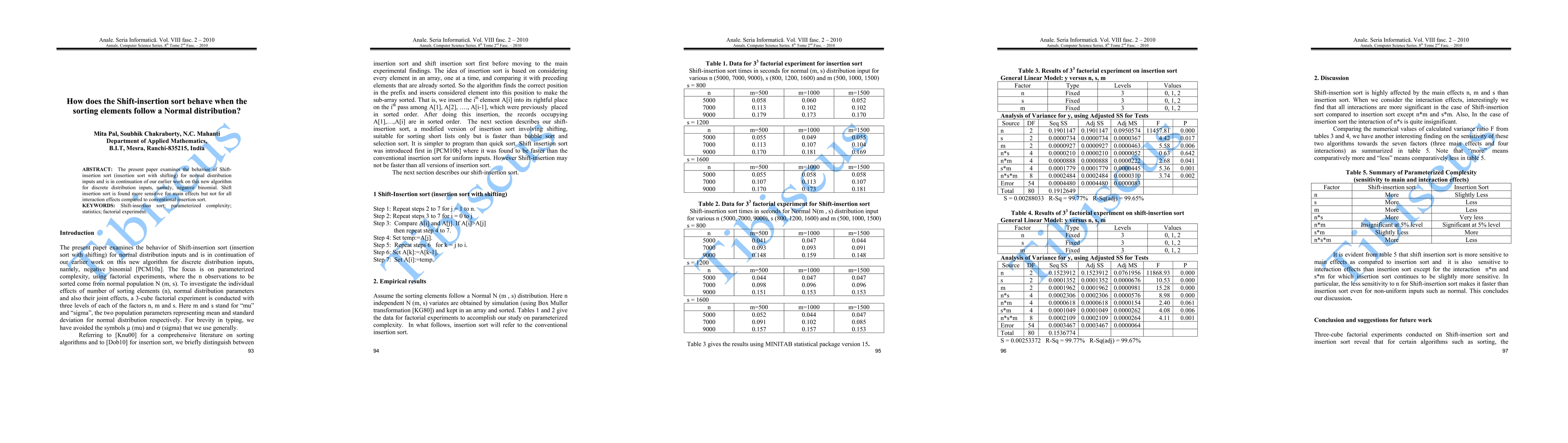 The present paper examines the behavior of Shift-insertion sort (insertion sort with shifting) for normal distribution inputs and is in continuation of our earlier work on this new algorithm for discrete distribution inputs, namely, negative binomial. Shift insertion sort is found more sensitive for main effects but not for all interaction effects compared to conventional insertion sort.