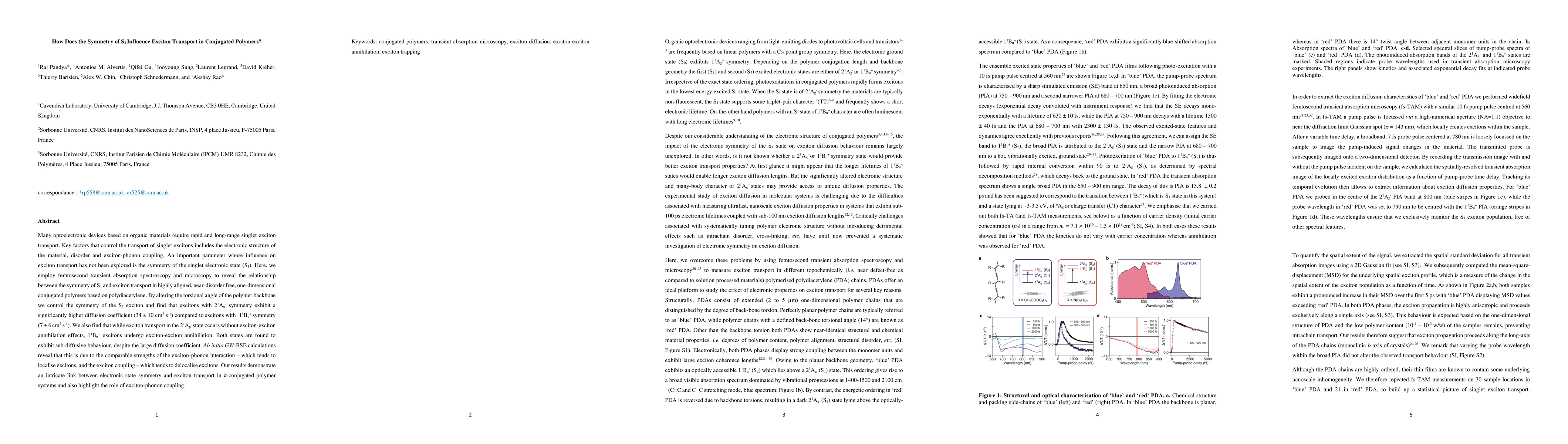 This study investigates how the symmetry of the singlet electronic state (S1) affects exciton transport in highly aligned, near-disorder-free conjugated polydiacetylene polymers using femtosecond transient absorption spectroscopy and microscopy. The findings reveal a significant relationship between S1 symmetry and the efficiency of singlet exciton transport.