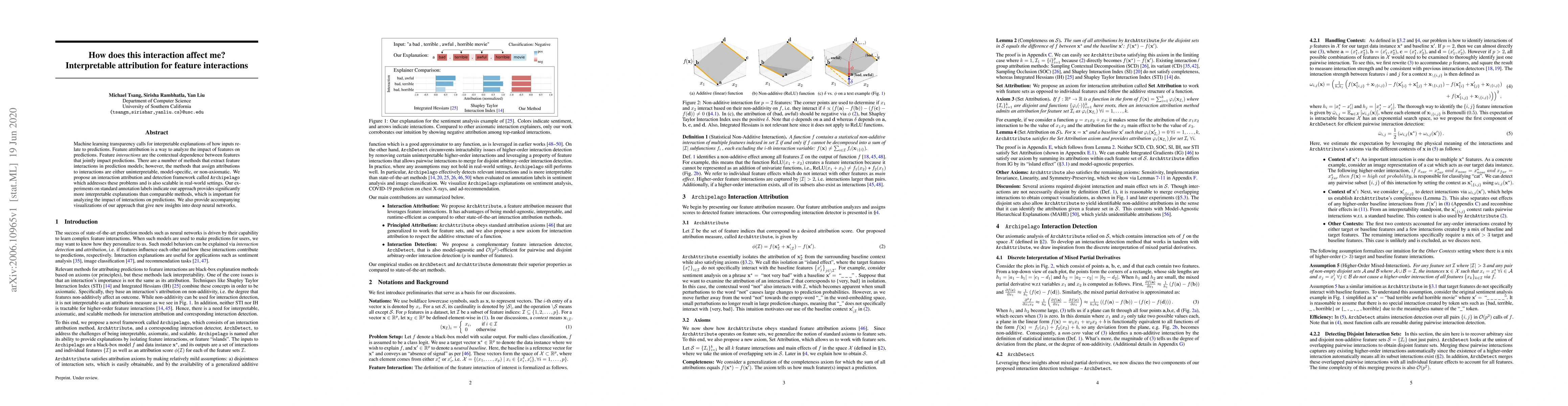 Machine learning transparency calls for interpretable explanations of how inputs relate to predictions. Feature attribution is a way to analyze the impact of features on predictions. Feature interactions are the contextual dependence between features that jointly impact predictions. There are a number of methods that extract feature interactions in prediction models; however, the methods that assign attributions to interactions are either uninterpretable, model-specific, or non-axiomatic. We propose an interaction attribution and detection framework called Archipelago which addresses these problems and is also scalable in real-world settings. Our experiments on standard annotation labels indicate our approach provides significantly more interpretable explanations than comparable methods, which is important for analyzing the impact of interactions on predictions. We also provide accompanying visualizations of our approach that give new insights into deep neural networks.