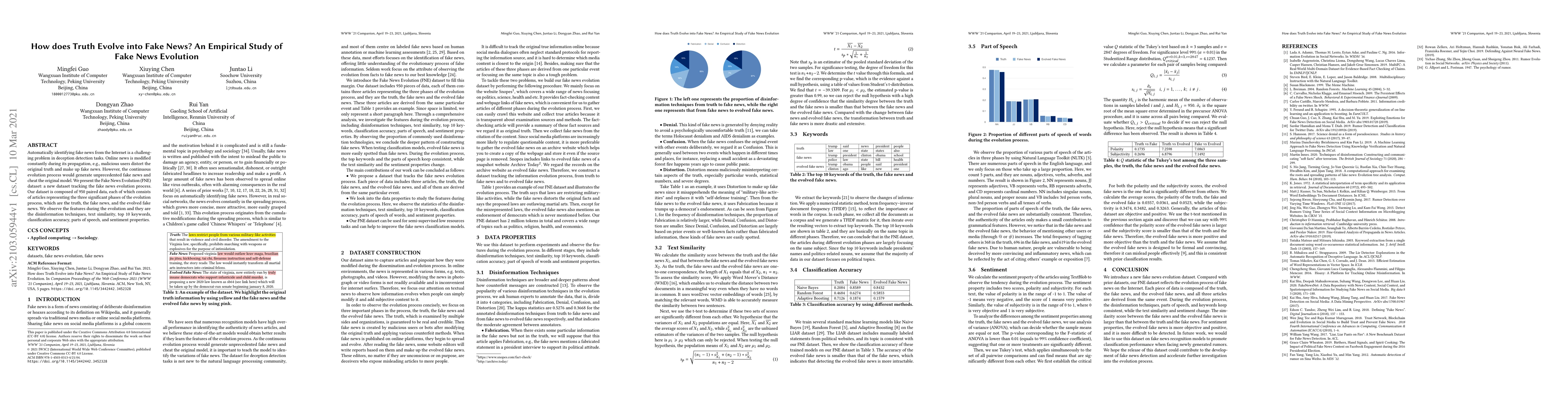 This paper introduces the Fake News Evolution (FNE) dataset to track the transformation of truth into fake news, consisting of 950 paired articles representing the truth, fake news, and evolved fake news. The study analyzes features like disinformation techniques, text similarity, and sentiment properties to understand the evolution process.