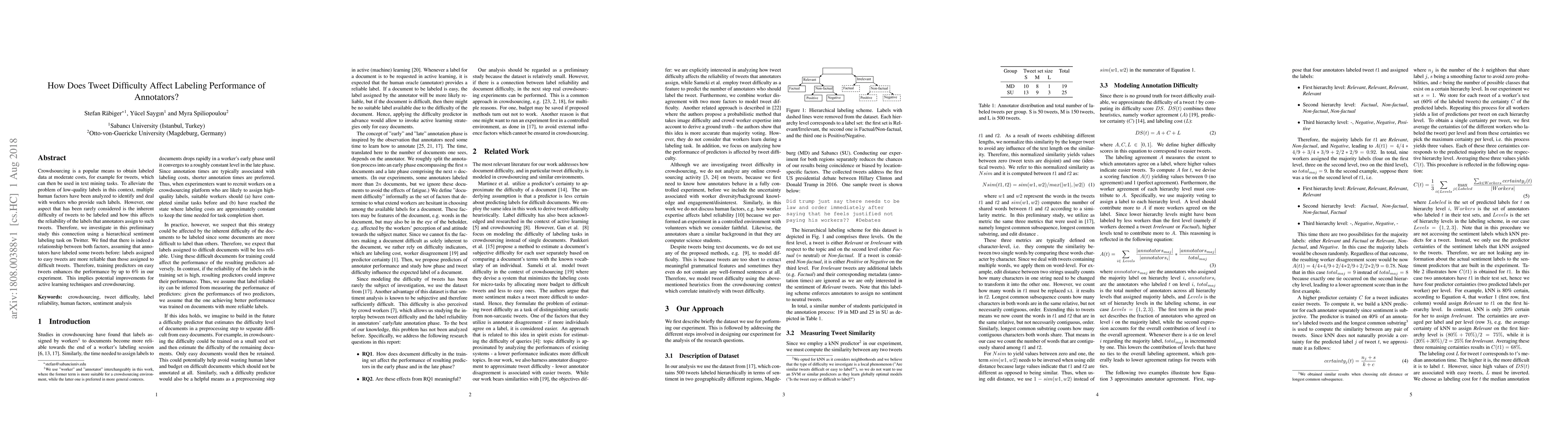 Crowdsourcing is a popular means to obtain labeled data at moderate costs, for example for tweets, which can then be used in text mining tasks. To alleviate the problem of low-quality labels in this context, multiple human factors have been analyzed to identify and deal with workers who provide such labels. However, one aspect that has been rarely considered is the inherent difficulty of tweets to be labeled and how this affects the reliability of the labels that annotators assign to such tweets. Therefore, we investigate in this preliminary study this connection using a hierarchical sentiment labeling task on Twitter. We find that there is indeed a relationship between both factors, assuming that annotators have labeled some tweets before: labels assigned to easy tweets are more reliable than those assigned to difficult tweets. Therefore, training predictors on easy tweets enhances the performance by up to 6% in our experiment. This implies potential improvements for active learning techniques and crowdsourcing.
