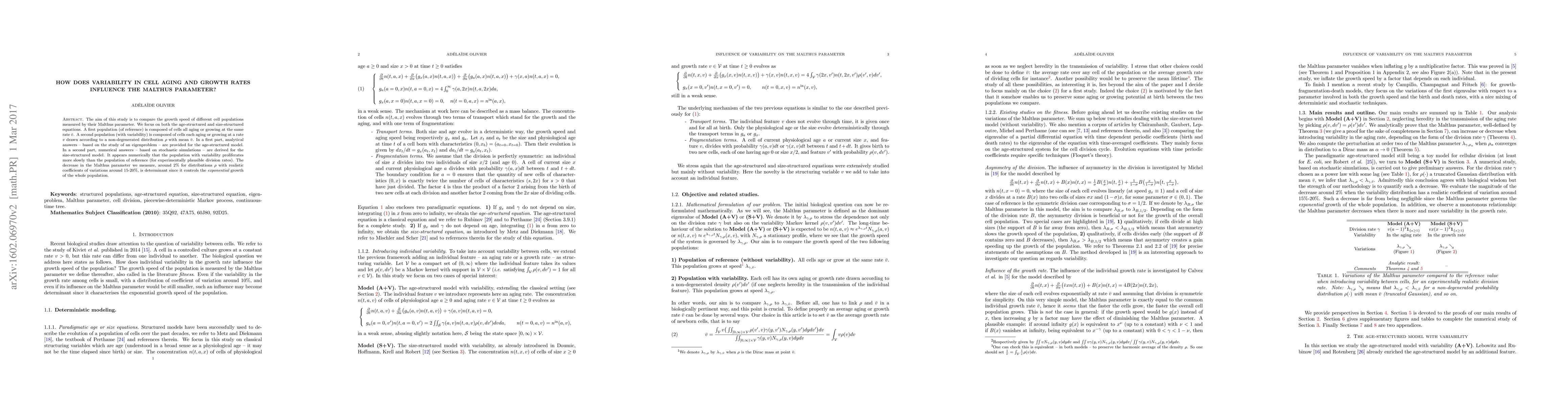 This study investigates how variability in cell aging and growth rates affects the Malthus parameter, comparing growth speeds of different cell populations. Results show that populations with variability proliferate more slowly than those with uniform rates, leading to a decrease in the Malthus parameter by approximately 2%, which significantly impacts population growth.