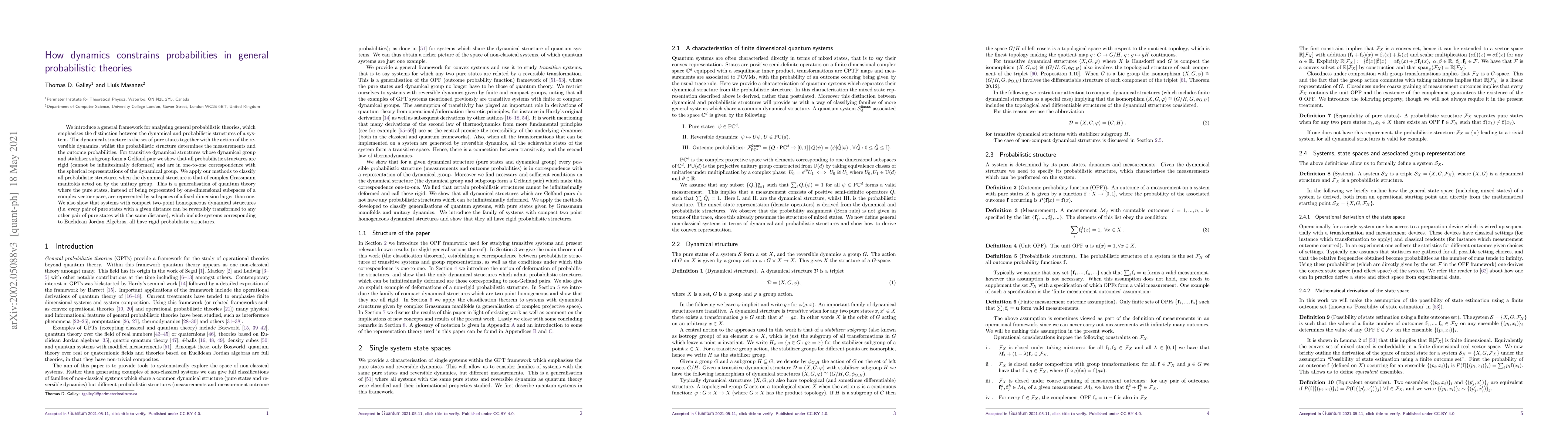 We introduce a general framework for analysing general probabilistic theories, which emphasises the distinction between the dynamical and probabilistic structures of a system. The dynamical structure is the set of pure states together with the action of the reversible dynamics, whilst the probabilistic structure determines the measurements and the outcome probabilities. For transitive dynamical structures whose dynamical group and stabiliser subgroup form a Gelfand pair we show that all probabilistic structures are rigid (cannot be infinitesimally deformed) and are in one-to-one correspondence with the spherical representations of the dynamical group. We apply our methods to classify all probabilistic structures when the dynamical structure is that of complex Grassmann manifolds acted on by the unitary group. This is a generalisation of quantum theory where the pure states, instead of being represented by one-dimensional subspaces of a complex vector space, are represented by subspaces of a fixed dimension larger than one. We also show that systems with compact two-point homogeneous dynamical structures (i.e. every pair of pure states with a given distance can be reversibly transformed to any other pair of pure states with the same distance), which include systems corresponding to Euclidean Jordan Algebras, all have rigid probabilistic structures.