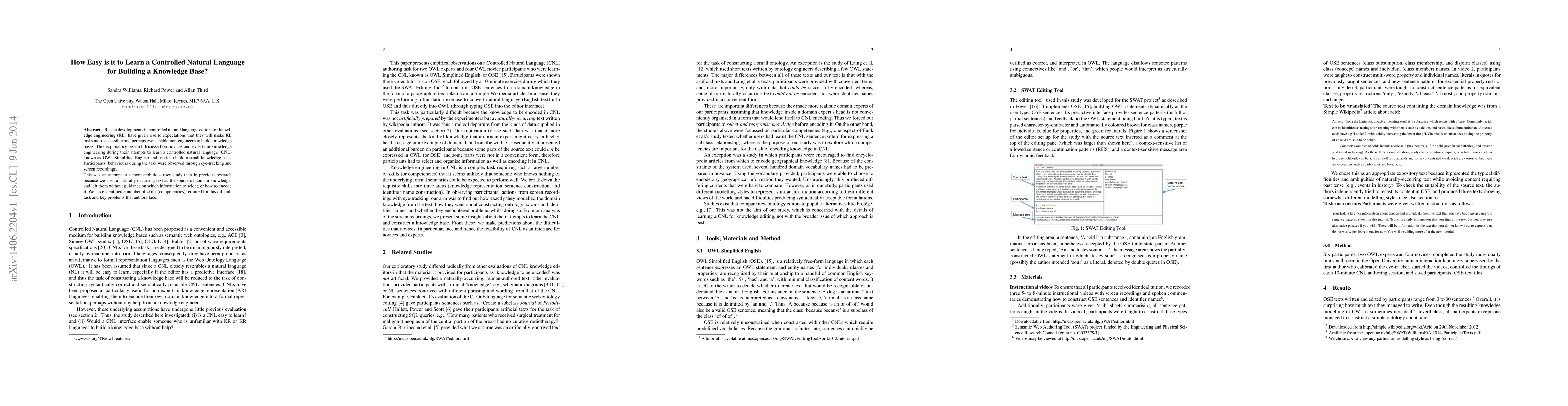 Recent developments in controlled natural language editors for knowledge engineering (KE) have given rise to expectations that they will make KE tasks more accessible and perhaps even enable non-engineers to build knowledge bases. This exploratory research focussed on novices and experts in knowledge engineering during their attempts to learn a controlled natural language (CNL) known as OWL Simplified English and use it to build a small knowledge base. Participants' behaviours during the task were observed through eye-tracking and screen recordings. This was an attempt at a more ambitious user study than in previous research because we used a naturally occurring text as the source of domain knowledge, and left them without guidance on which information to select, or how to encode it. We have identified a number of skills (competencies) required for this difficult task and key problems that authors face.