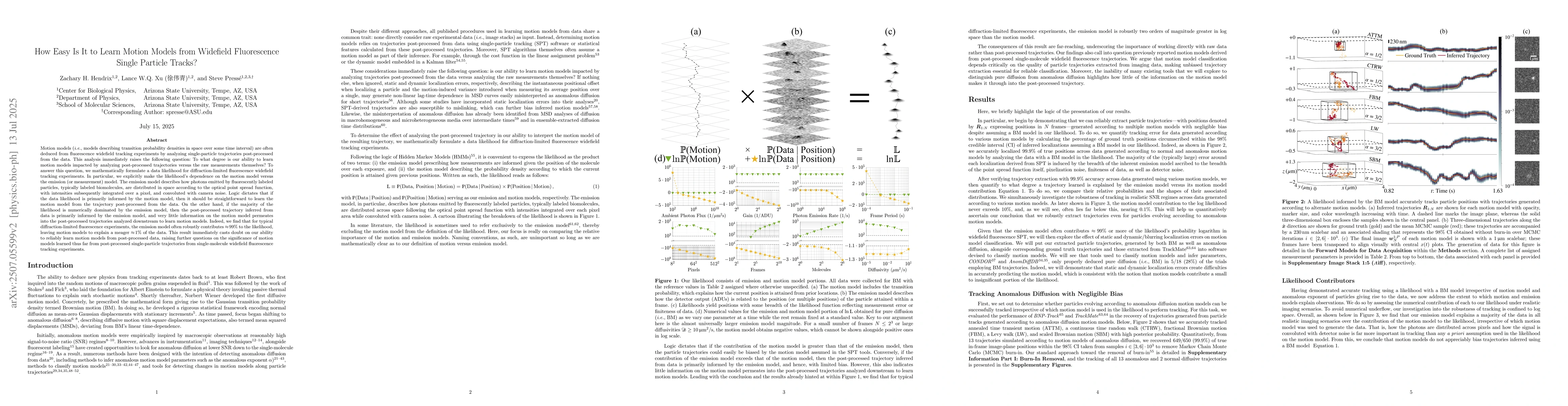 Motion models are often deduced from fluorescence widefield tracking experiments by analyzing single-particle trajectories post-processed from the data. This analysis immediately raises the following question: To what degree is our ability to learn motion models impacted by analyzing post-processed trajectories versus the raw measurements? To answer this question, we mathematically formulate a data likelihood for diffraction-limited fluorescence widefield tracking experiments. In particular, we explicitly make the likelihood's dependence on the motion model versus the emission model (or measurement model). The emission model describes how photons emitted by fluorescently labeled particles are distributed in space according to the optical point spread function, with intensities subsequently integrated over a pixel, and convoluted with camera noise. Logic dictates that if the data likelihood is primarily informed by the motion model, then it should be straightforward to learn the motion model from the trajectory post-processed from the data. On the other hand, if the majority of the likelihood is numerically dominated by the emission model, then the post-processed trajectory inferred from data is primarily informed by the emission model, and very little information on the motion model permeates into the post-processed trajectories analyzed downstream to learn motion models. We find that for typical diffraction-limited fluorescence experiments, the emission model often robustly contributes approximately 99% to the likelihood, leaving motion models to explain approximately 1% of the data. This result immediately casts doubt on our ability to reliably learn motion models from post-processed data, raising further questions on the significance of motion models learned thus far from post-processed single-particle trajectories from single-molecule widefield fluorescence tracking experiments.