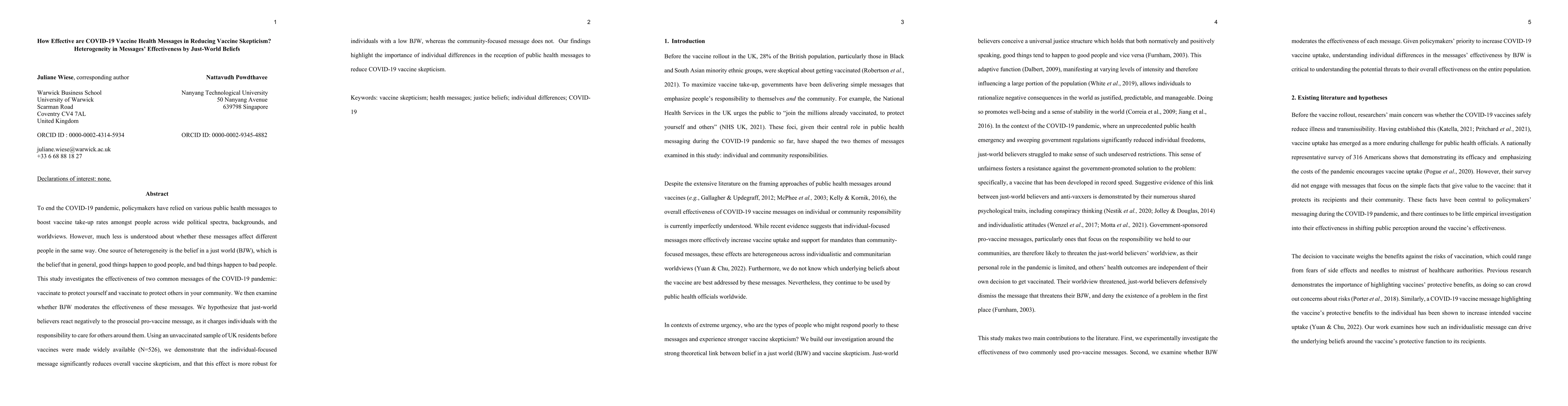 To end the COVID-19 pandemic, policymakers have relied on various public health messages to boost vaccine take-up rates amongst people across wide political spectra, backgrounds, and worldviews. However, much less is understood about whether these messages affect different people in the same way. One source of heterogeneity is the belief in a just world (BJW), which is the belief that in general, good things happen to good people, and bad things happen to bad people. This study investigates the effectiveness of two common messages of the COVID-19 pandemic: vaccinate to protect yourself and vaccinate to protect others in your community. We then examine whether BJW moderates the effectiveness of these messages. We hypothesize that just-world believers react negatively to the prosocial pro-vaccine message, as it charges individuals with the responsibility to care for others around them. Using an unvaccinated sample of UK residents before vaccines were made widely available (N=526), we demonstrate that the individual-focused message significantly reduces overall vaccine skepticism, and that this effect is more robust for individuals with a low BJW, whereas the community-focused message does not. Our findings highlight the importance of individual differences in the reception of public health messages to reduce COVID-19 vaccine skepticism.
