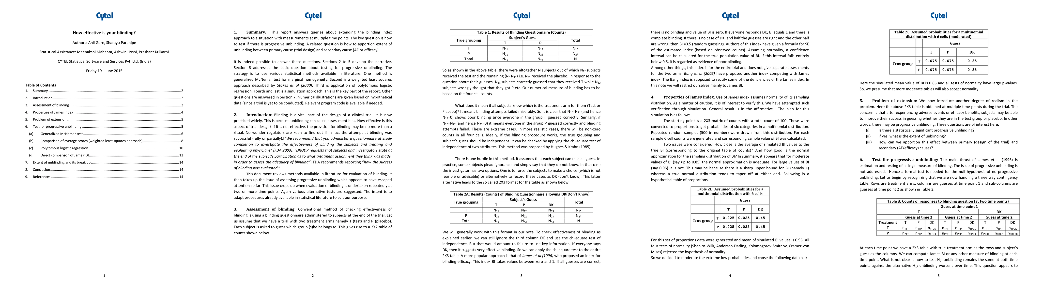 This report answers queries about extending the blinding index approach to a situation with measurements at multiple time points. The key question is how to test if there is progressive unblinding. A related question is how to apportion extent of unblinding between primary cause (trial design) and secondary cause (AE or efficacy). It is indeed possible to answer these questions. Sections 2 to 5 develop the narrative. Section 6 addresses the basic question about testing for progressive unblinding. The strategy is to use various statistical methods available in literature. One method is generalized McNemar test for marginal homogeneity. Second is a weighted least squares approach described by Stokes et al (2000). Third is application of polytomous logistic regression. Fourth and last is a simulation approach. This is the key part of the report. Other questions are answered in Section 7. Numerical illustrations are given based on hypothetical data (since a trial is yet to be conducted). Relevant program code is available if needed.