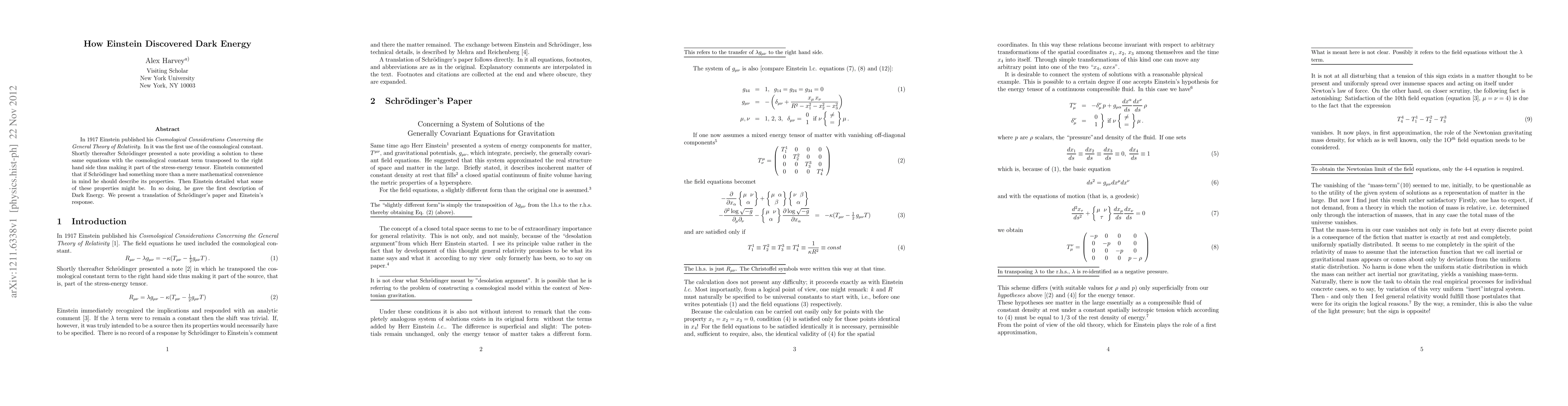 In 1917 Einstein published his Cosmological Considerations Concerning the General Theory of Relativity. In it was the first use of the cosmological constant. Shortly thereafter Schr\"odinger presented a note providing a solution to these same equations with the cosmological constant term transposed to the right hand side thus making it part of the stress-energy tensor. Einstein commented that if Schr\"odinger had something more than a mere mathematical convenience in mind he should describe its properties. Then Einstein detailed what some of these properties might be. In so doing, he gave the first description of Dark Energy. We present a translation of Schr\"odinger's paper and Einstein's response.