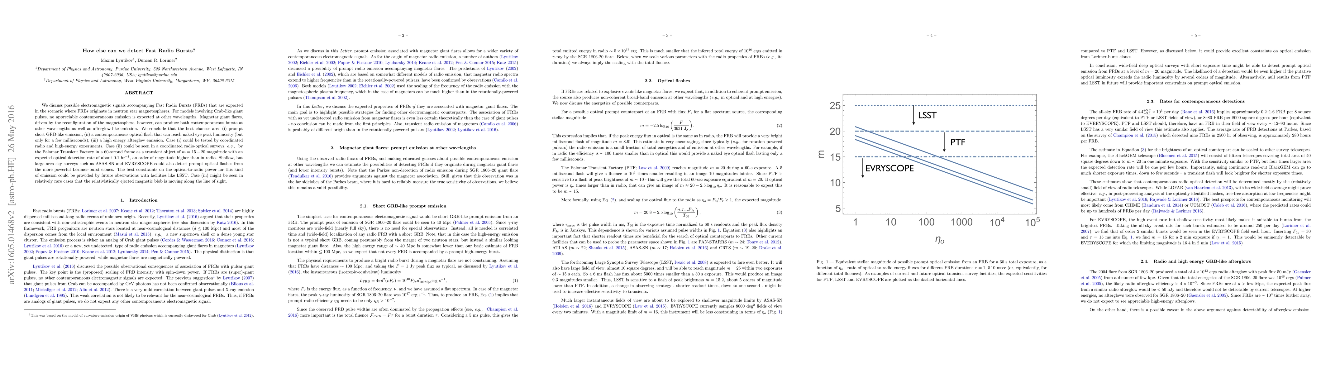 We discuss possible electromagnetic signals accompanying Fast Radio Bursts (FRBs) that are expected in the scenario where FRBs originate in neutron star magnetospheres. For models involving Crab-like giant pulses, no appreciable contemporaneous emission is expected at other wavelengths. Magnetar giant flares, driven by the reconfiguration of the magnetosphere, however, can produce both contemporaneous bursts at other wavelengths as well as afterglow-like emission. We conclude that the best chances are: (i) prompt short GRB-like emission; (ii) a contemporaneous optical flash that can reach naked eye peak luminosity (but only for a few milliseconds); (iii) a high energy afterglow emission. Case (i) could be tested by coordinated radio and high-energy experiments. Case (ii) could be seen in a coordinated radio-optical surveys, \eg\ by the Palomar Transient Factory in a 60-second frame as a transient object of $m=15-20$ magnitude with an expected optical detection rate of about 0.1~hr$^{-1}$, an order of magnitude higher than in radio. Shallow, but large-area sky surveys such as ASAS-SN and EVRYSCOPE could also detect prompt optical flashes from the more powerful Lorimer-burst clones. The best constraints on the optical-to-radio power for this kind of emission could be provided by future observations with facilities like LSST. Case (iii) might be seen in relatively rare cases that the relativistically ejected magnetic blob is moving along the line of sight.