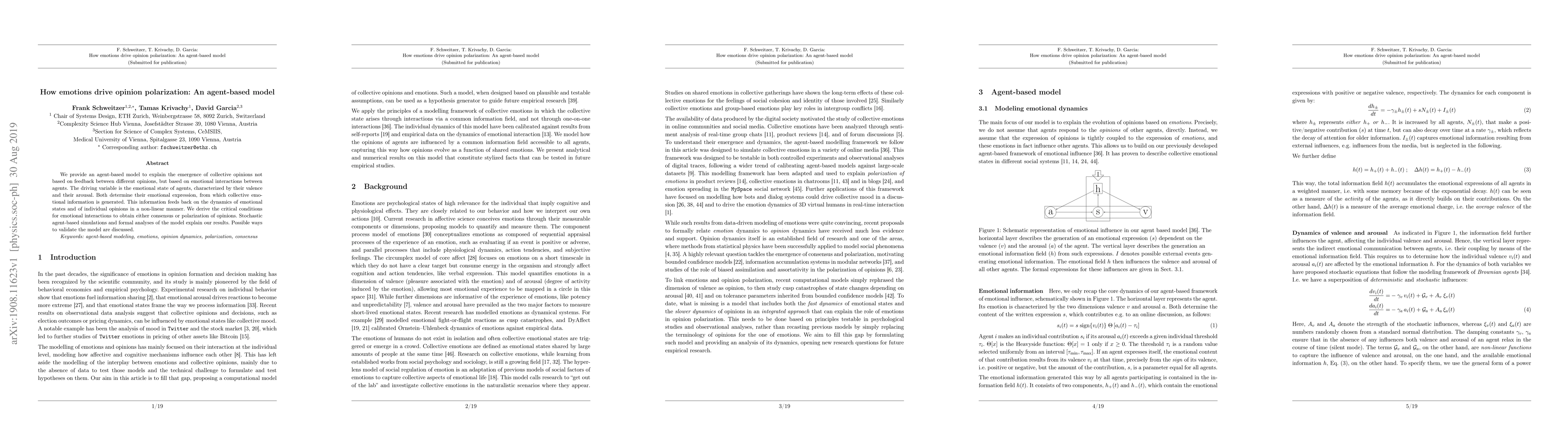 We provide an agent-based model to explain the emergence of collective opinions not based on feedback between different opinions, but based on emotional interactions between agents. The driving variable is the emotional state of agents, characterized by their valence and their arousal. Both determine their emotional expression, from which collective emotional information is generated. This information feeds back on the dynamics of emotional states and of individual opinions in a non-linear manner. We derive the critical conditions for emotional interactions to obtain either consensus or polarization of opinions. Stochastic agent-based simulations and formal analyses of the model explain our results. Possible ways to validate the model are discussed.