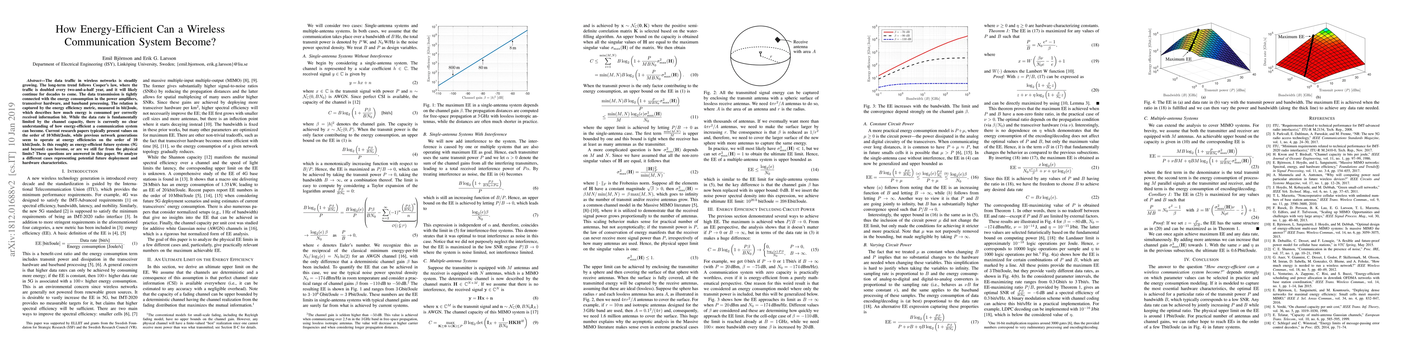 The data traffic in wireless networks is steadily growing. The long-term trend follows Cooper's law, where the traffic is doubled every two-and-a-half year, and it will likely continue for decades to come. The data transmission is tightly connected with the energy consumption in the power amplifiers, transceiver hardware, and baseband processing. The relation is captured by the energy efficiency metric, measured in bit/Joule, which describes how much energy is consumed per correctly received information bit. While the data rate is fundamentally limited by the channel capacity, there is currently no clear understanding of how energy-efficient a communication system can become. Current research papers typically present values on the order of 10 Mbit/Joule, while previous network generations seem to operate at energy efficiencies on the order of 10 kbit/Joule. Is this roughly as energy-efficient future systems (5G and beyond) can become, or are we still far from the physical limits? These questions are answered in this paper. We analyze a different cases representing potential future deployment and hardware characteristics.