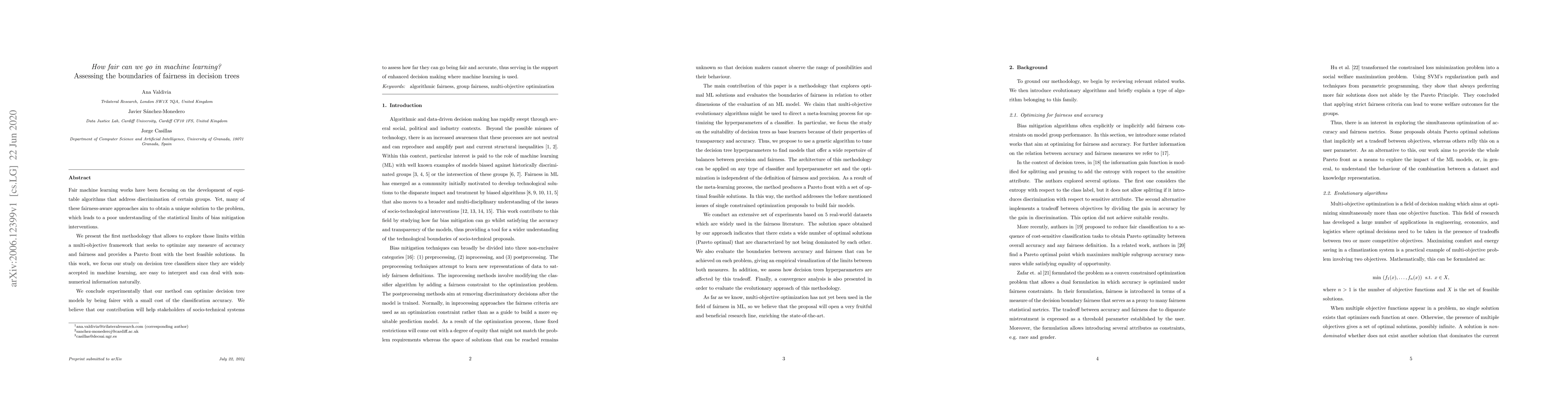 Fair machine learning works have been focusing on the development of equitable algorithms that address discrimination of certain groups. Yet, many of these fairness-aware approaches aim to obtain a unique solution to the problem, which leads to a poor understanding of the statistical limits of bias mitigation interventions. We present the first methodology that allows to explore those limits within a multi-objective framework that seeks to optimize any measure of accuracy and fairness and provides a Pareto front with the best feasible solutions. In this work, we focus our study on decision tree classifiers since they are widely accepted in machine learning, are easy to interpret and can deal with non-numerical information naturally. We conclude experimentally that our method can optimize decision tree models by being fairer with a small cost of the classification error. We believe that our contribution will help stakeholders of sociotechnical systems to assess how far they can go being fair and accurate, thus serving in the support of enhanced decision making where machine learning is used.
