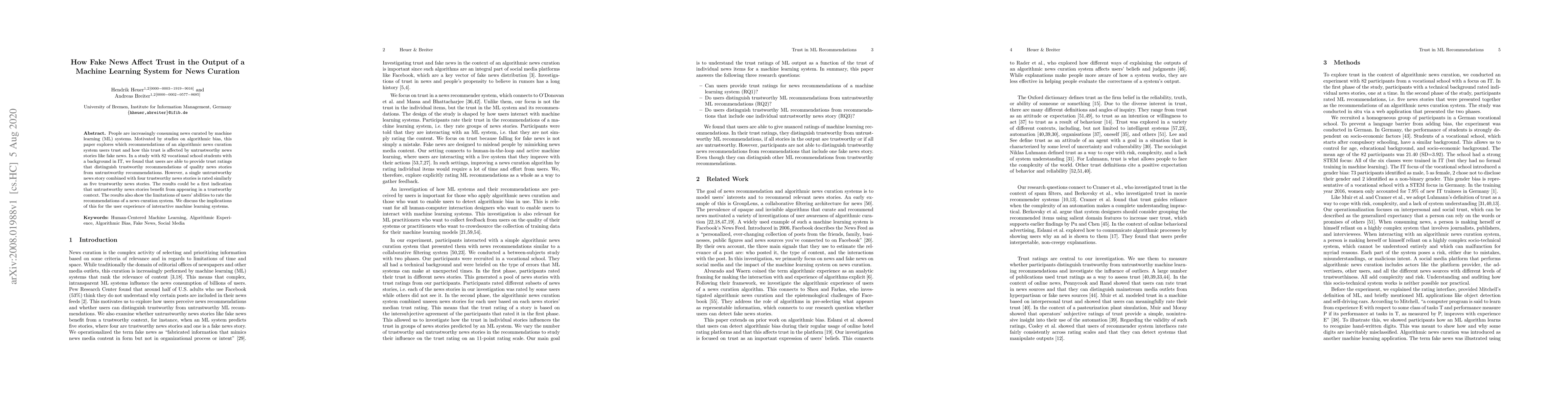 This paper investigates how fake news impacts user trust in machine learning systems for news curation. Findings from a study with IT-trained students reveal that while users can distinguish trustworthy news recommendations, a single fake news story among four trustworthy ones is rated similarly to all trustworthy stories, suggesting that fake news benefits from a trustworthy context.
