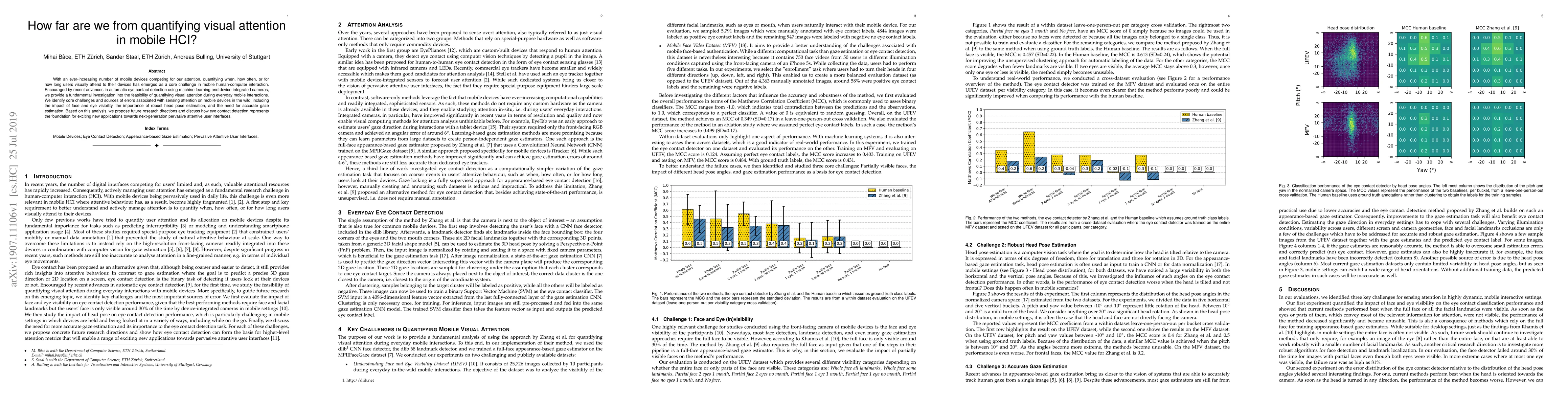 This paper investigates the challenges of quantifying visual attention in mobile human-computer interaction, highlighting issues like face and eye visibility, head pose estimation, and gaze accuracy. It proposes future research directions and suggests that eye contact detection is crucial for developing next-generation attentive user interfaces.