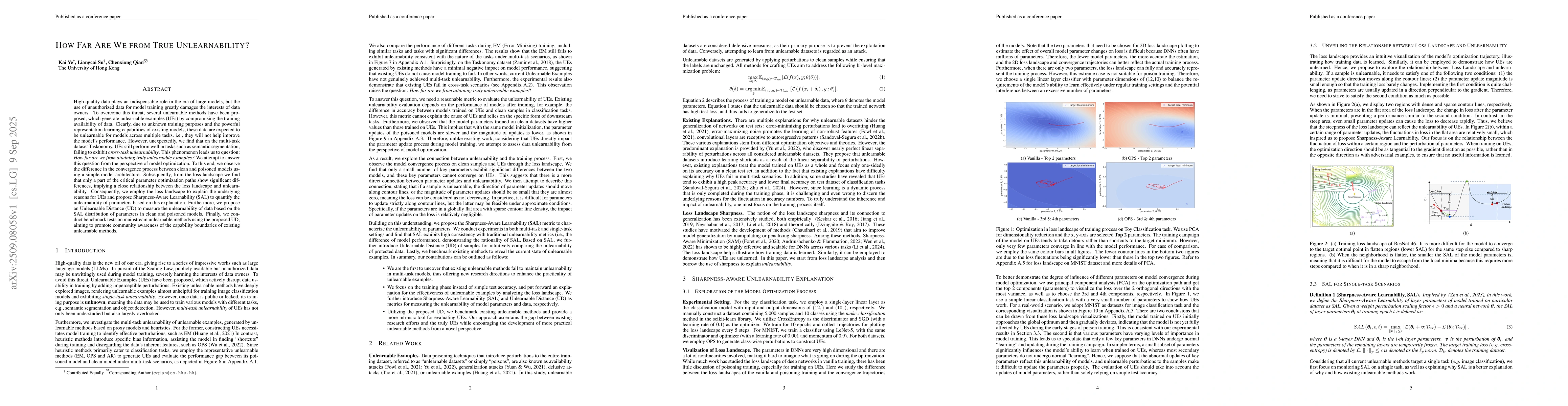 High-quality data plays an indispensable role in the era of large models, but the use of unauthorized data for model training greatly damages the interests of data owners. To overcome this threat, several unlearnable methods have been proposed, which generate unlearnable examples (UEs) by compromising the training availability of data. Clearly, due to unknown training purposes and the powerful representation learning capabilities of existing models, these data are expected to be unlearnable for models across multiple tasks, i.e., they will not help improve the model's performance. However, unexpectedly, we find that on the multi-task dataset Taskonomy, UEs still perform well in tasks such as semantic segmentation, failing to exhibit cross-task unlearnability. This phenomenon leads us to question: How far are we from attaining truly unlearnable examples? We attempt to answer this question from the perspective of model optimization. To this end, we observe the difference in the convergence process between clean and poisoned models using a simple model architecture. Subsequently, from the loss landscape we find that only a part of the critical parameter optimization paths show significant differences, implying a close relationship between the loss landscape and unlearnability. Consequently, we employ the loss landscape to explain the underlying reasons for UEs and propose Sharpness-Aware Learnability (SAL) to quantify the unlearnability of parameters based on this explanation. Furthermore, we propose an Unlearnable Distance (UD) to measure the unlearnability of data based on the SAL distribution of parameters in clean and poisoned models. Finally, we conduct benchmark tests on mainstream unlearnable methods using the proposed UD, aiming to promote community awareness of the capability boundaries of existing unlearnable methods.