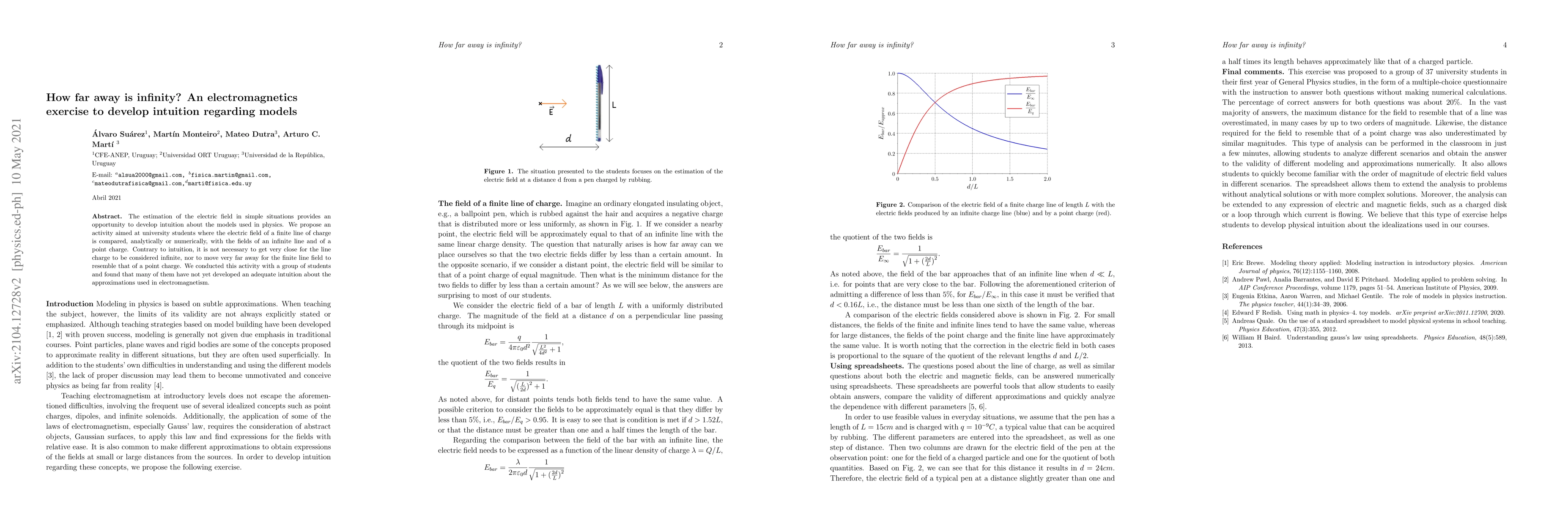 Students' intuition about infinite line charges was tested; results showed that finite line fields resemble point charges at unexpected distances, highlighting the need for accurate models in electromagnetism.