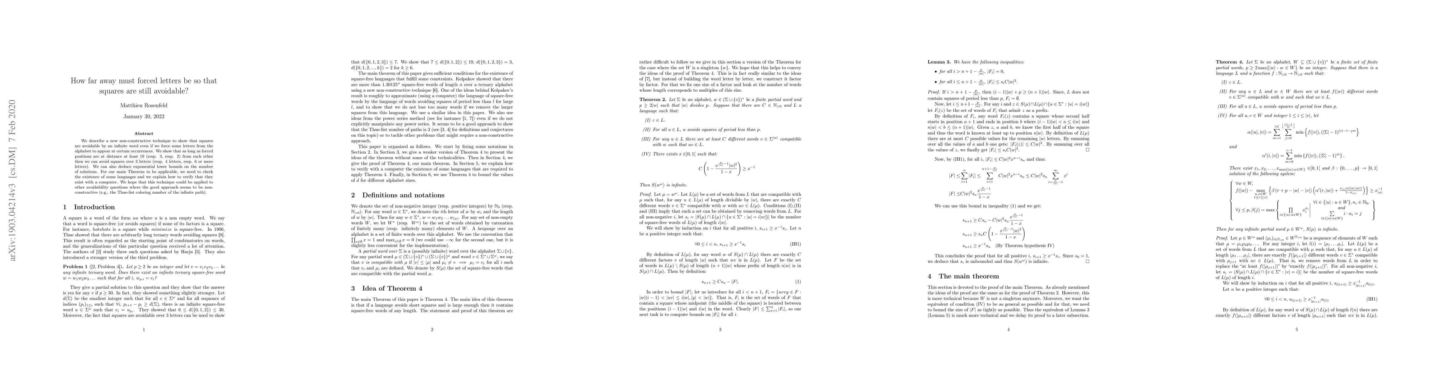 We describe a new non-constructive technique to show that squares are avoidable by an infinite word even if we force some letters from the alphabet to appear at certain occurrences. We show that as long as forced positions are at distance at least 19 (resp. 3, resp. 2) from each other then we can avoid squares over 3 letters (resp. 4 letters, resp. 6 or more letters). We can also deduce exponential lower bounds on the number of solutions. For our main Theorem to be applicable, we need to check the existence of some languages and we explain how to verify that they exist with a computer. We hope that this technique could be applied to other avoidability questions where the good approach seems to be non-constructive (e.g., the Thue-list coloring number of the infinite path).