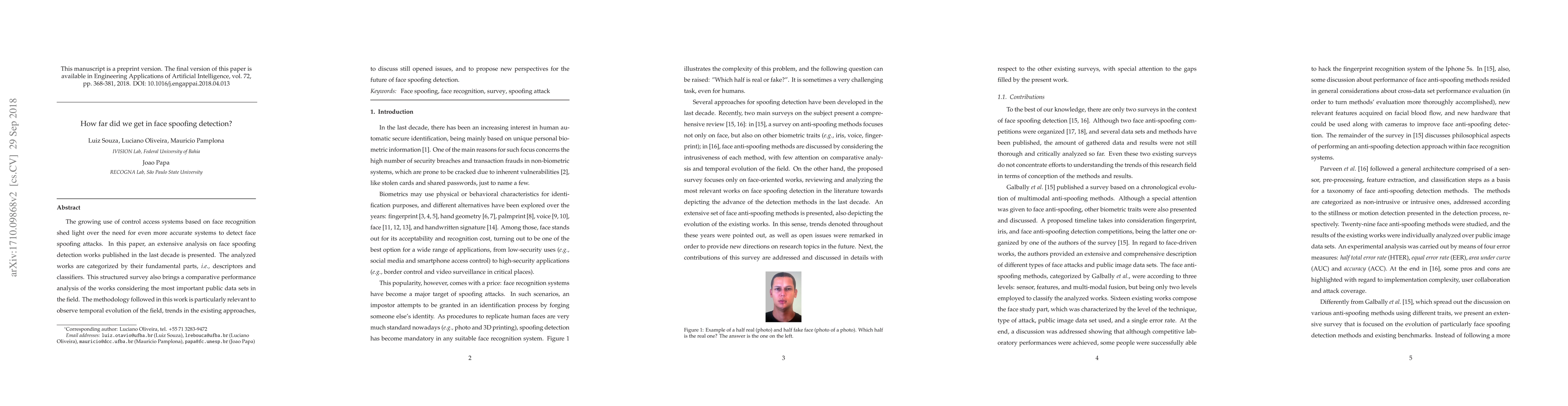 The paper presents an extensive analysis of face spoofing detection works published in the last decade, categorizing them by their fundamental parts—descriptors and classifiers. It also provides a temporal evolution of the field and a comparative analysis using important public datasets.
