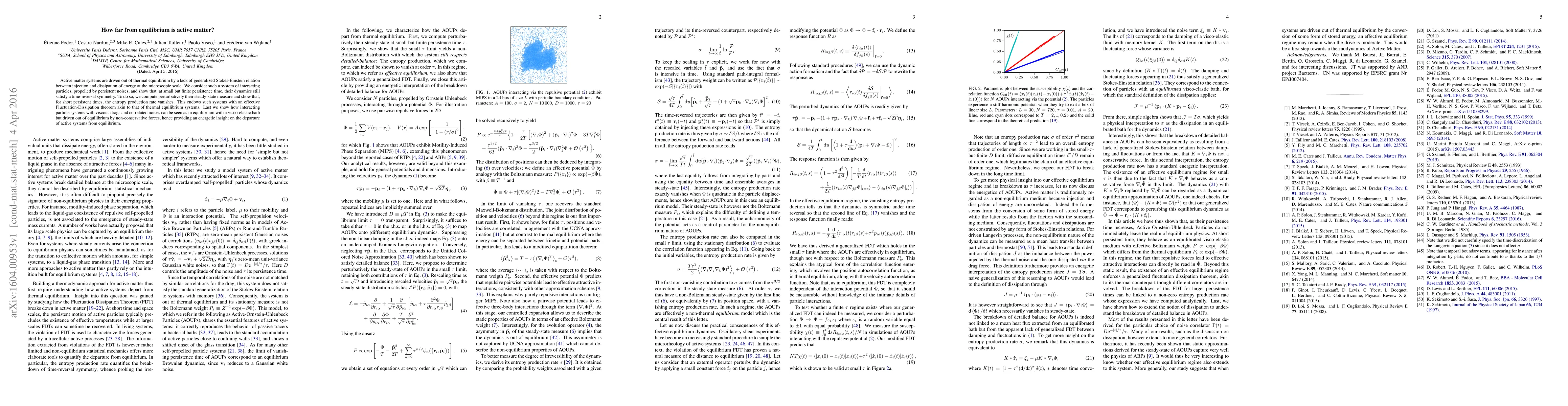 Active matter systems are driven out of thermal equilibrium by a lack of generalized Stokes-Einstein relation between injection and dissipation of energy at the microscopic scale. We consider such a system of interacting particles, propelled by persistent noises, and show that, at small but finite persistence time, their dynamics still satisfy a time-reversal symmetry. To do so, we compute perturbatively their steady-state measure and show that, for short persistent times, the entropy production rate vanishes. This endows such systems with an effective Fluctuation-Dissipation theorem akin to that of thermal equilibrium systems. Last we show how interacting particle systems with viscous drags and correlated noises can be seen as in equilibrium with a visco-elastic bath but driven out of equilibrium by non-conservative forces, hence providing an energetic insight on the departure of active systems from equilibrium.