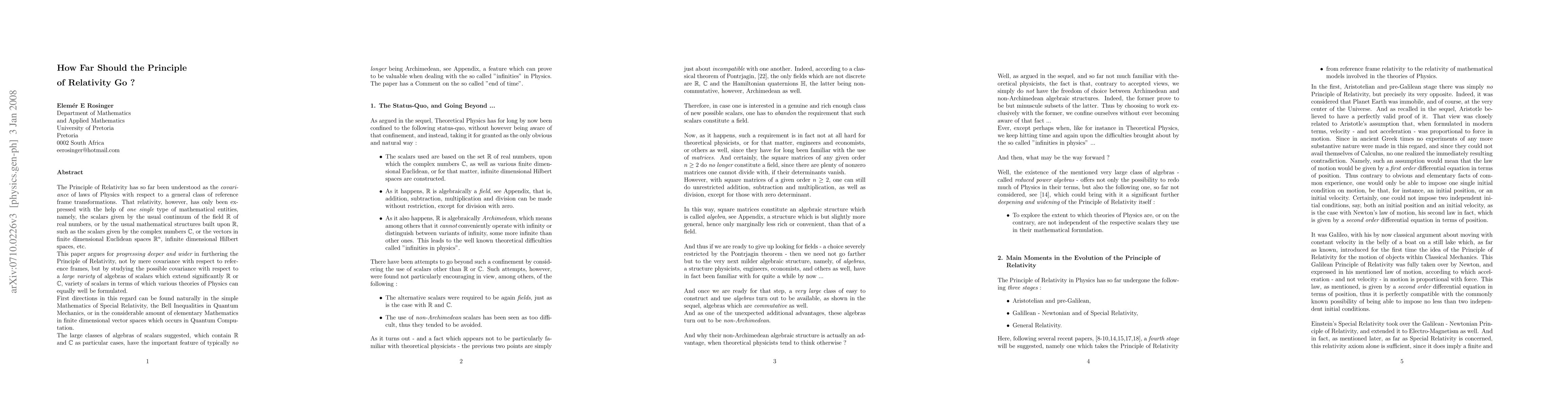 The Principle of Relativity has so far been understood as the {\it covariance} of laws of Physics with respect to a general class of reference frame transformations. That relativity, however, has only been expressed with the help of {\it one single} type of mathematical entities, namely, the scalars given by the usual continuum of the field $\mathbb{R}$ of real numbers, or by the usual mathematical structures built upon $\mathbb{R}$, such as the scalars given by the complex numbers $\mathbb{C}$, or the vectors in finite dimensional Euclidean spaces $\mathbb{R}^n$, infinite dimensional Hilbert spaces, etc. This paper argues for {\it progressing deeper and wider} in furthering the Principle of Relativity, not by mere covariance with respect to reference frames, but by studying the possible covariance with respect to a {\it large variety} of algebras of scalars which extend significantly $\mathbb{R}$ or $\mathbb{C}$, variety of scalars in terms of which various theories of Physics can equally well be formulated. First directions in this regard can be found naturally in the simple Mathematics of Special Relativity, the Bell Inequalities in Quantum Mechanics, or in the considerable amount of elementary Mathematics in finite dimensional vector spaces which occurs in Quantum Computation. The large classes of algebras of scalars suggested, which contain $\mathbb{R}$ and $\mathbb{C}$ as particular cases, have the important feature of typically {\it no longer} being Archimedean, see Appendix, a feature which can prove to be valuable when dealing with the so called "infinities" in Physics. The paper has a Comment on the so called "end of time".