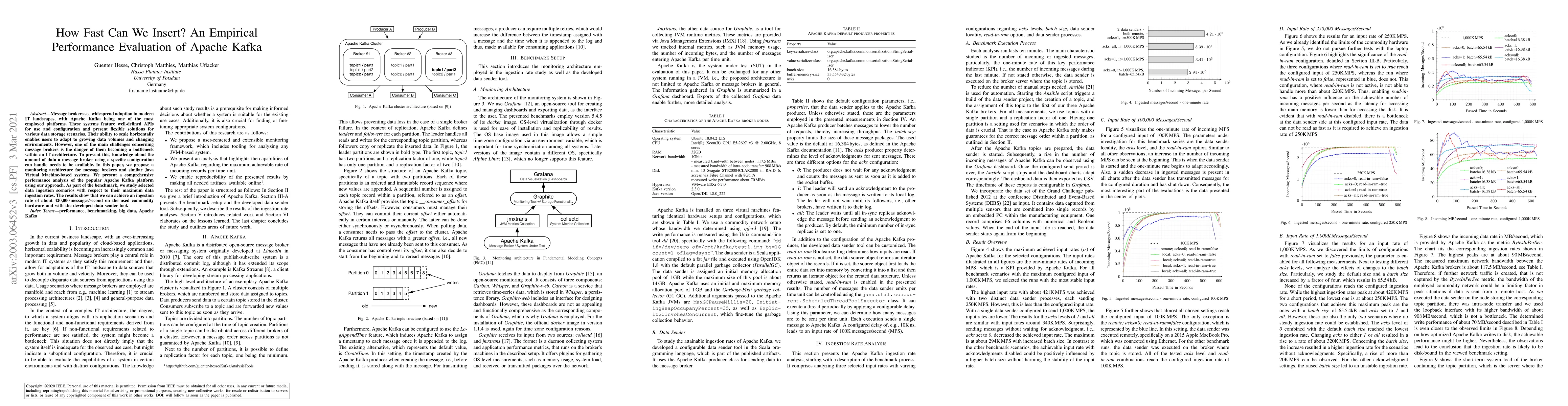This paper evaluates the performance of Apache Kafka, a popular message broker, through a comprehensive monitoring architecture. The study finds that Kafka can achieve a maximum data ingestion rate of approximately 420,000 messages per second on standard hardware, highlighting its scalability and potential to avoid becoming a bottleneck in IT architectures.