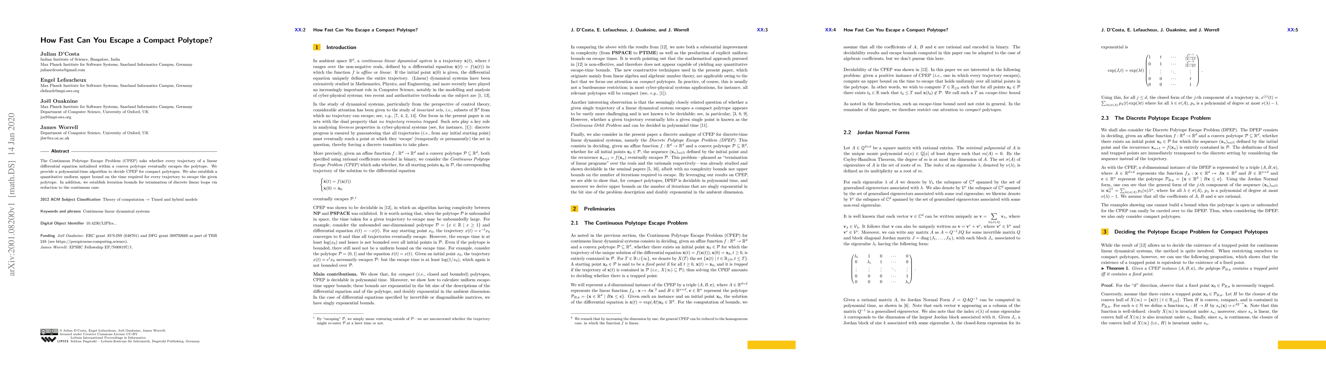 Researchers developed a polynomial-time algorithm to determine if every trajectory of a linear differential equation can escape a compact polytope, providing a quantitative upper bound on the time required for escape.