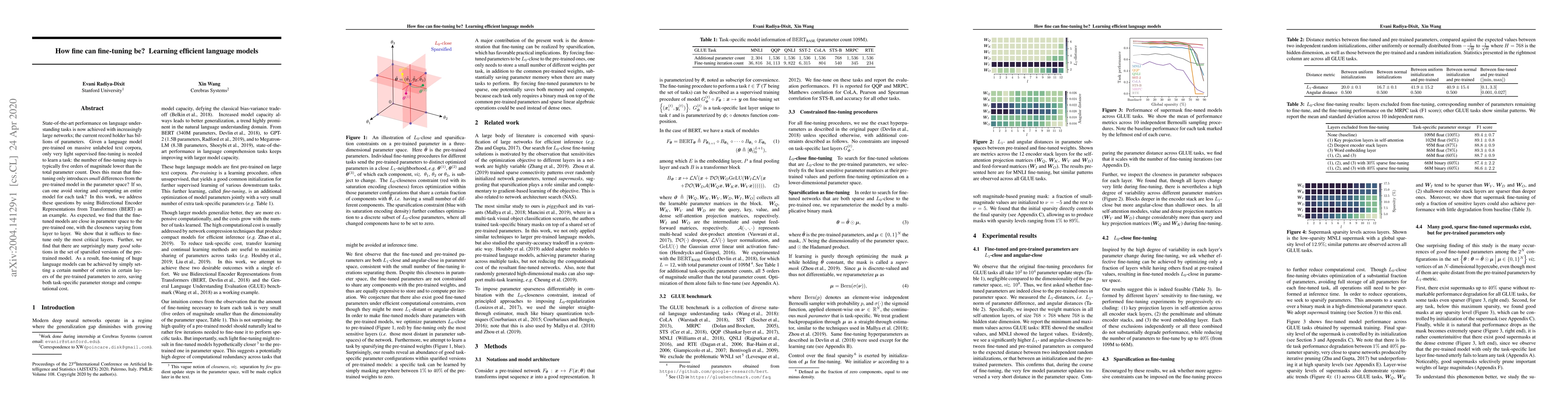 State-of-the-art performance on language understanding tasks is now achieved with increasingly large networks; the current record holder has billions of parameters. Given a language model pre-trained on massive unlabeled text corpora, only very light supervised fine-tuning is needed to learn a task: the number of fine-tuning steps is typically five orders of magnitude lower than the total parameter count. Does this mean that fine-tuning only introduces small differences from the pre-trained model in the parameter space? If so, can one avoid storing and computing an entire model for each task? In this work, we address these questions by using Bidirectional Encoder Representations from Transformers (BERT) as an example. As expected, we find that the fine-tuned models are close in parameter space to the pre-trained one, with the closeness varying from layer to layer. We show that it suffices to fine-tune only the most critical layers. Further, we find that there are surprisingly many good solutions in the set of sparsified versions of the pre-trained model. As a result, fine-tuning of huge language models can be achieved by simply setting a certain number of entries in certain layers of the pre-trained parameters to zero, saving both task-specific parameter storage and computational cost.