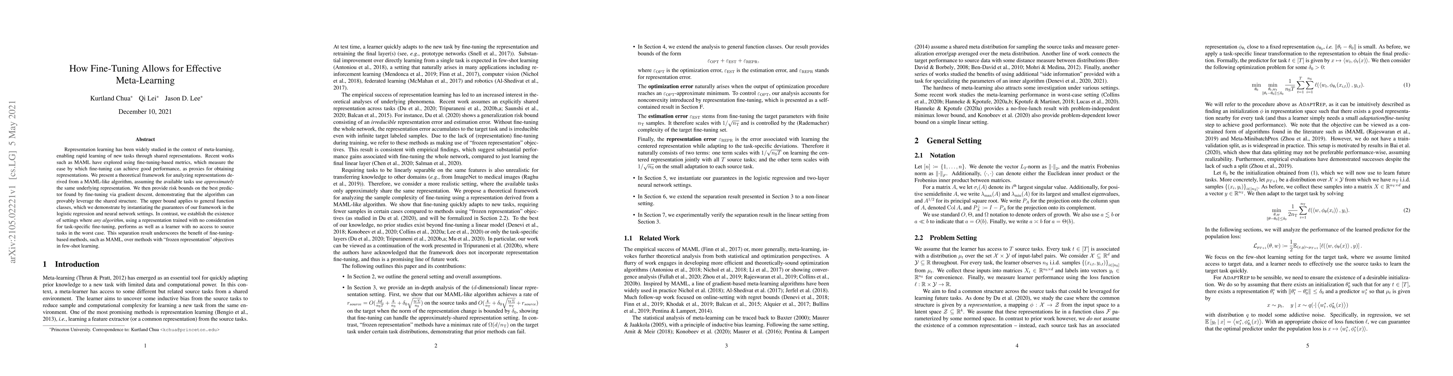 This paper presents a theoretical framework to analyze representations from a MAML-like meta-learning algorithm, showing that fine-tuning-based methods can effectively leverage shared task structures. It demonstrates that fine-tuning outperforms "frozen representation" methods in few-shot learning scenarios.