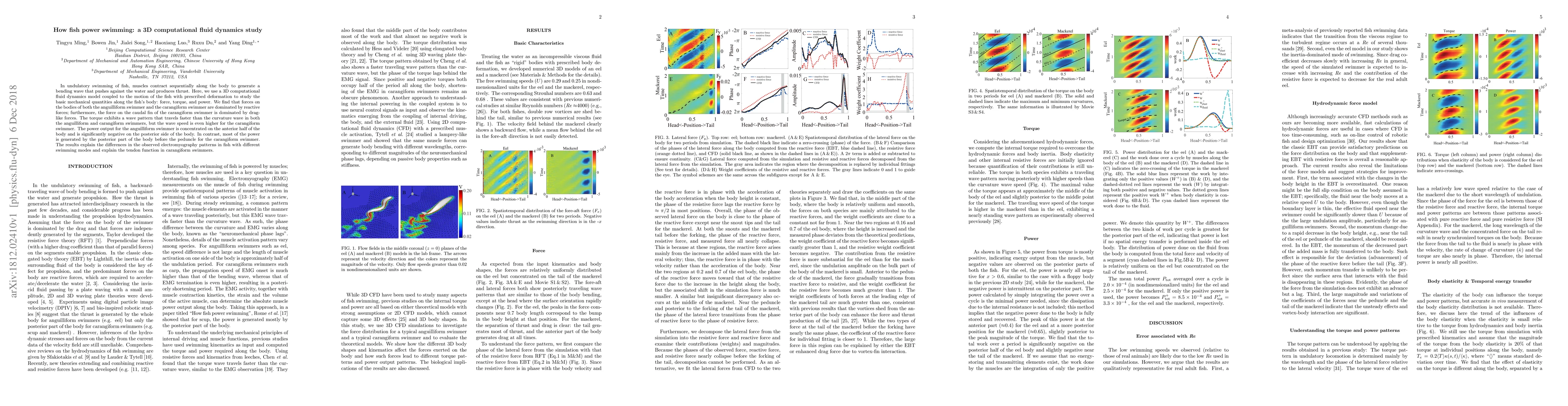 A 3D computational fluid dynamics study reveals that fish swimming mechanics are dominated by reactive forces, with varying power output distribution between anguilliform and carangiform swimmers.