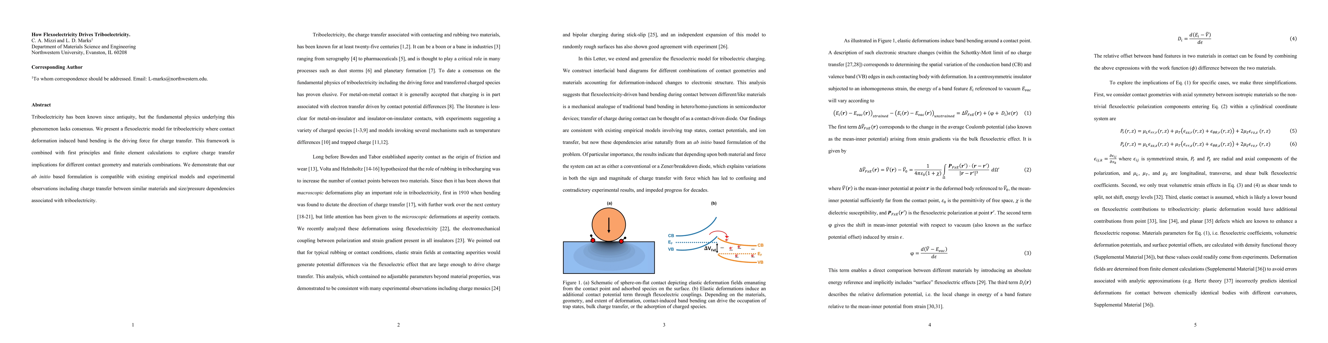 This paper proposes a flexoelectric model explaining triboelectricity, where contact deformation-induced band bending drives charge transfer. The model is validated through first principles and finite element calculations, showing compatibility with existing empirical models and experimental data.