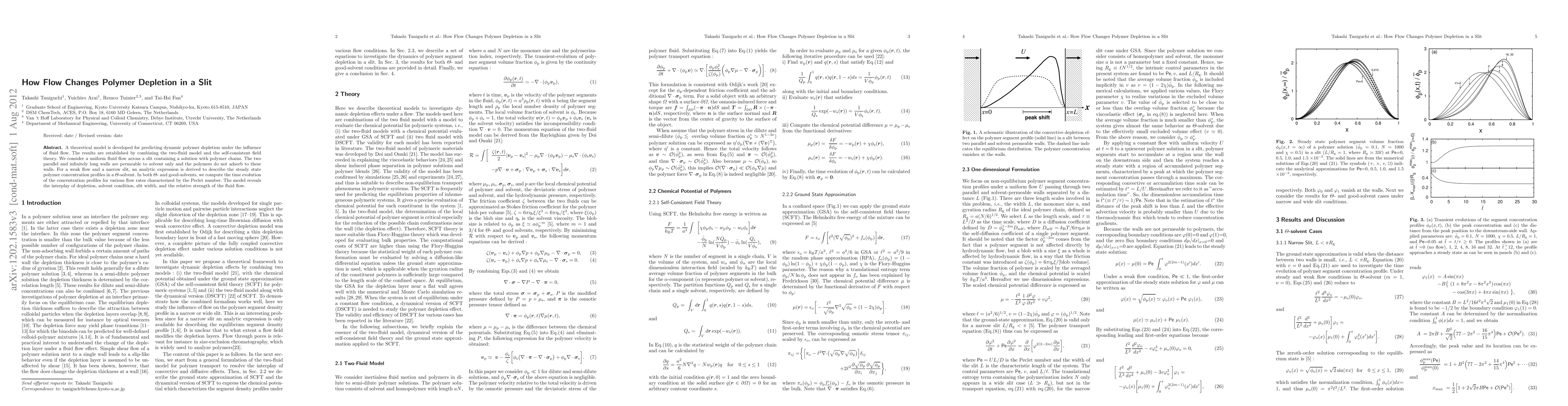This paper develops a theoretical model combining two-fluid dynamics and self-consistent field theory to predict polymer depletion effects under fluid flow in a slit. It derives analytic expressions and computes time evolution of polymer concentration profiles, revealing the interplay of flow strength, solvent conditions, and slit width on polymer depletion.