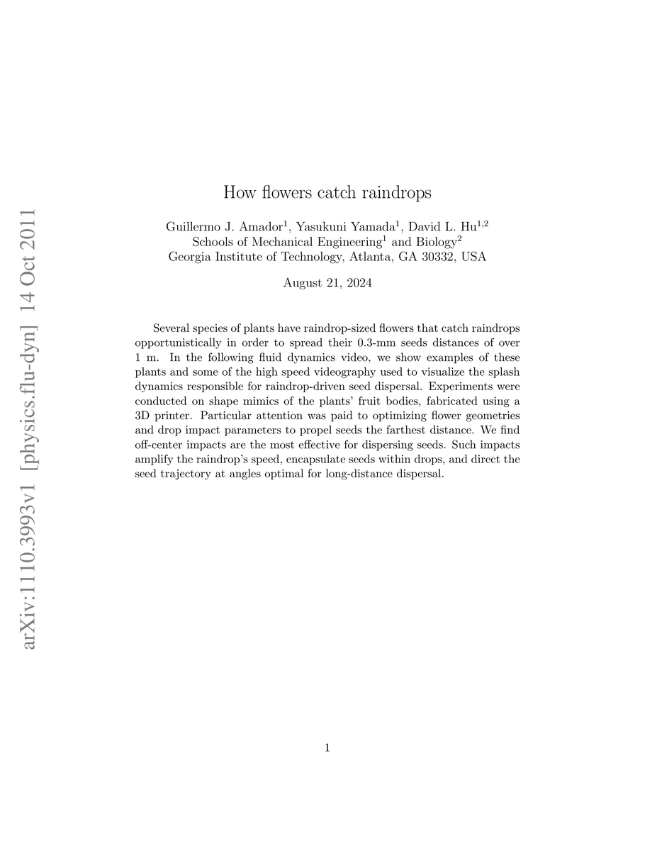 Researchers found that off-center impacts from raindrops on flowers with optimized geometries can disperse seeds over 1m distances, using high-speed videography to visualize the splash dynamics.
