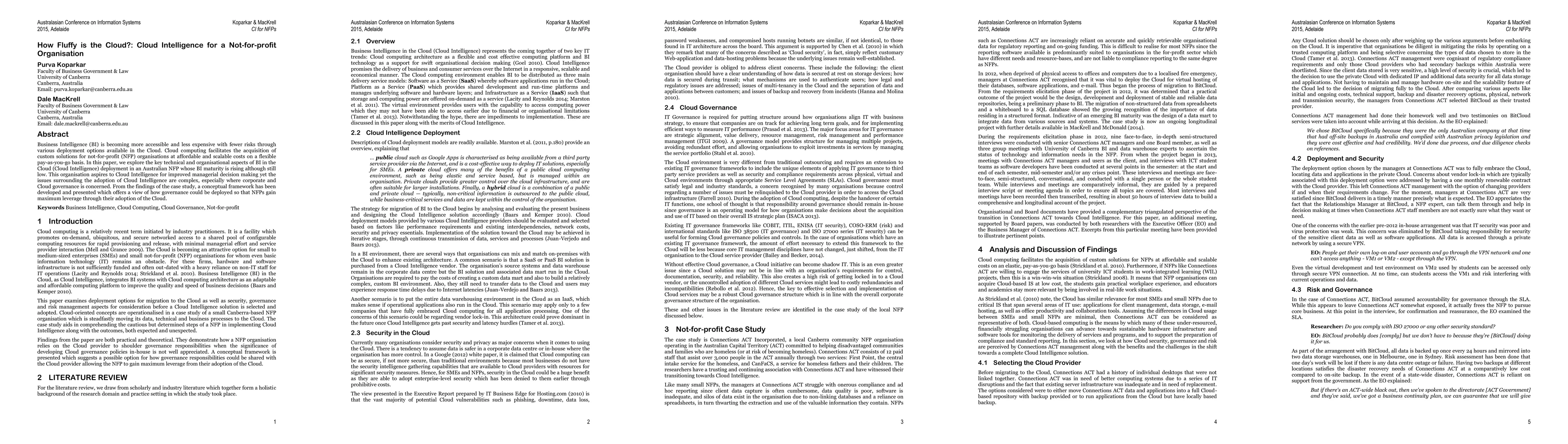 Business Intelligence (BI) is becoming more accessible and less expensive with fewer risks through various deployment options available in the Cloud. Cloud computing facilitates the acquisition of custom solutions for not-for-profit (NFP) organisations at affordable and scalable costs on a flexible pay-as-you-go basis. In this paper, we explore the key technical and organisational aspects of BI in the Cloud (Cloud Intelligence) deployment in an Australian NFP whose BI maturity is rising although still low. This organisation aspires to Cloud Intelligence for improved managerial decision making yet the issues surrounding the adoption of Cloud Intelligence are complex, especially where corporate and Cloud governance is concerned. From the findings of the case study, a conceptual framework has been developed and presented which offers a view of how governance could be deployed so that NFPs gain maximum leverage through their adoption of the Cloud.