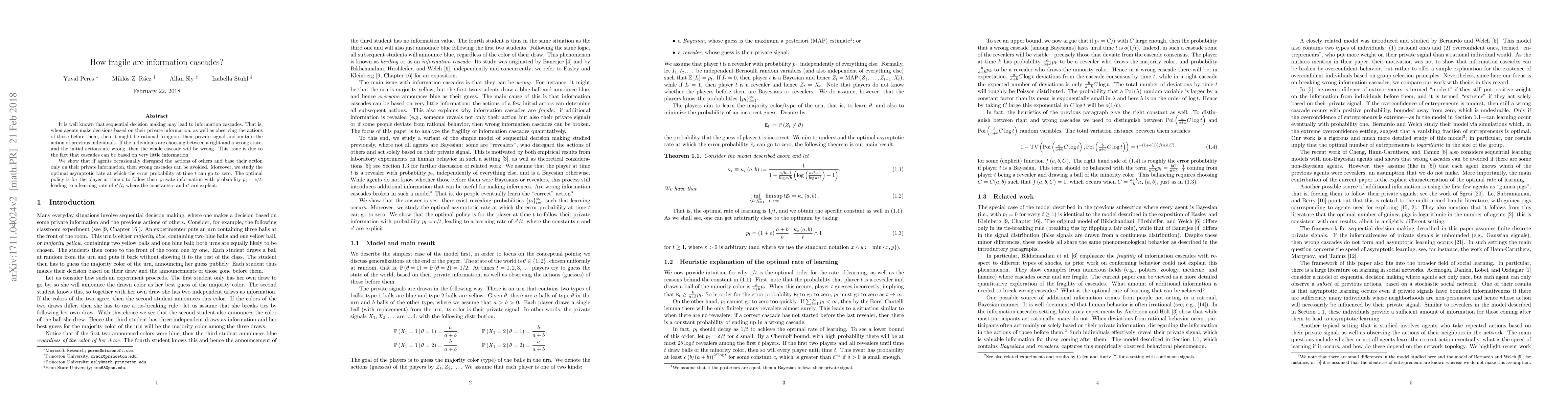 This paper explores how information cascades can go wrong when individuals follow others rather than their private signals. It proposes a strategy where agents occasionally rely solely on their private information to avoid wrong cascades, determining an optimal learning rate where the error probability decreases over time.